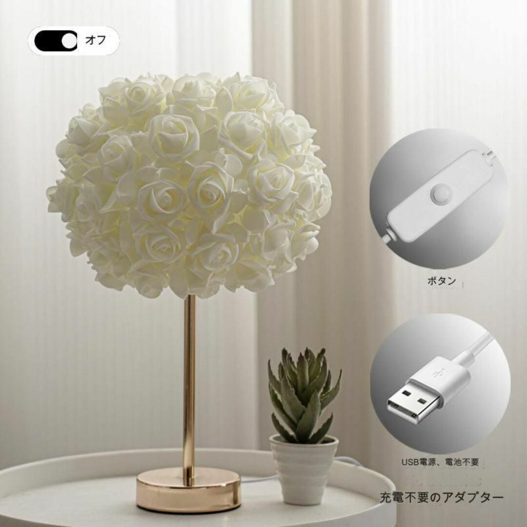 テーブルランプ デスクライト インテリアライト ランプシェード かわいい 円形 癒し 52本の薔薇 ホワイト 白 USB充電 おしゃれ 寝室 リビング 書斎 LEDライト