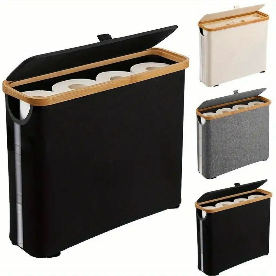こちらは、シンプルでおしゃれなデザインのトイレットペーパーホルダー付き収納バッグです。最大12ロールのトイレットペーパーを収納できるため、トイレやバスルームの収納にぴったり。防水加工が施されているので、水回りでも安心して使用できます。使わないときはコンパクトに折りたたんで収納でき、省スペースにも対応。リビングやキッチンでも多機能に使えるアイテムです。カラーバリエーションはブラック、グレー、ホワイトの3色から選べ、どんなインテリアにも調和するスタイリッシュな仕上がりです。