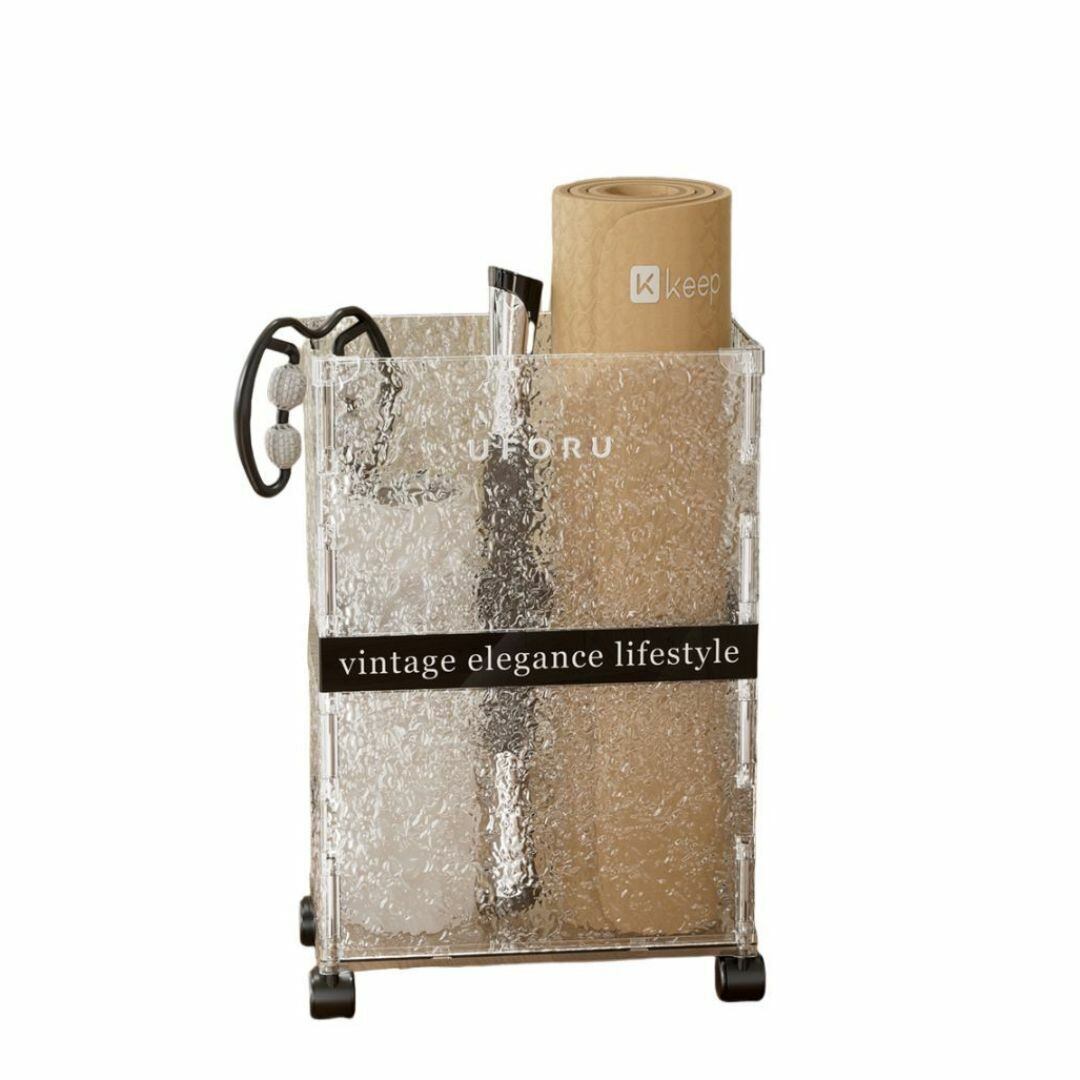 このカート式収納ボックスは、ヨガマットや大きめのアイテムも余裕で収納できる60Lの大容量が特徴です。半透明のデザインに、クリーム色の帯又はブラックの帯のアクセントがおしゃれで、どんなインテリアにもマッチします。キャスター付きなので、重い荷物もラクラク移動可能。多機能な設計で、リビングや玄関、寝室などの隙間収納として便利に使えます。長方形のシンプルなフォルムは室内をスッキリとした印象にまとめてくれる優秀な収納コンテナです。