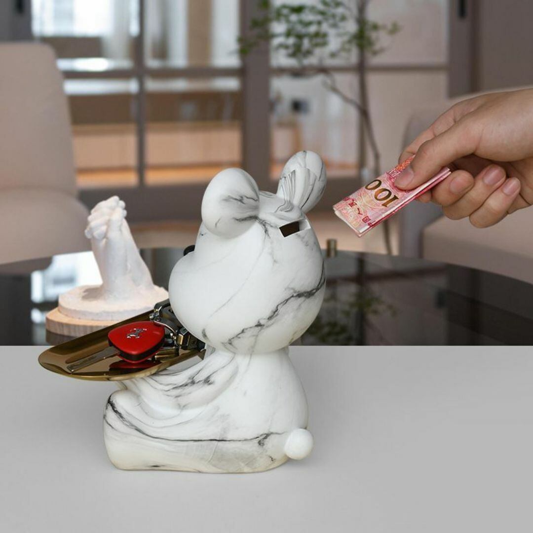 この小物入れ兼貯金箱は、金色のトレイを持ったかわいいクマのデザインが特徴的な置物です。取り出し口がないため、貯金箱としても楽しみながら、使うときにはトレイ部分に鍵やアクセサリー、小物などを置けます。クリエイティブなカラー展開があり、リビングや寝室に飾るだけでおしゃれなインテリアのアクセントに。愛らしいデザインと実用性が兼ね備わっているため、ギフトやプレゼントにも最適です。