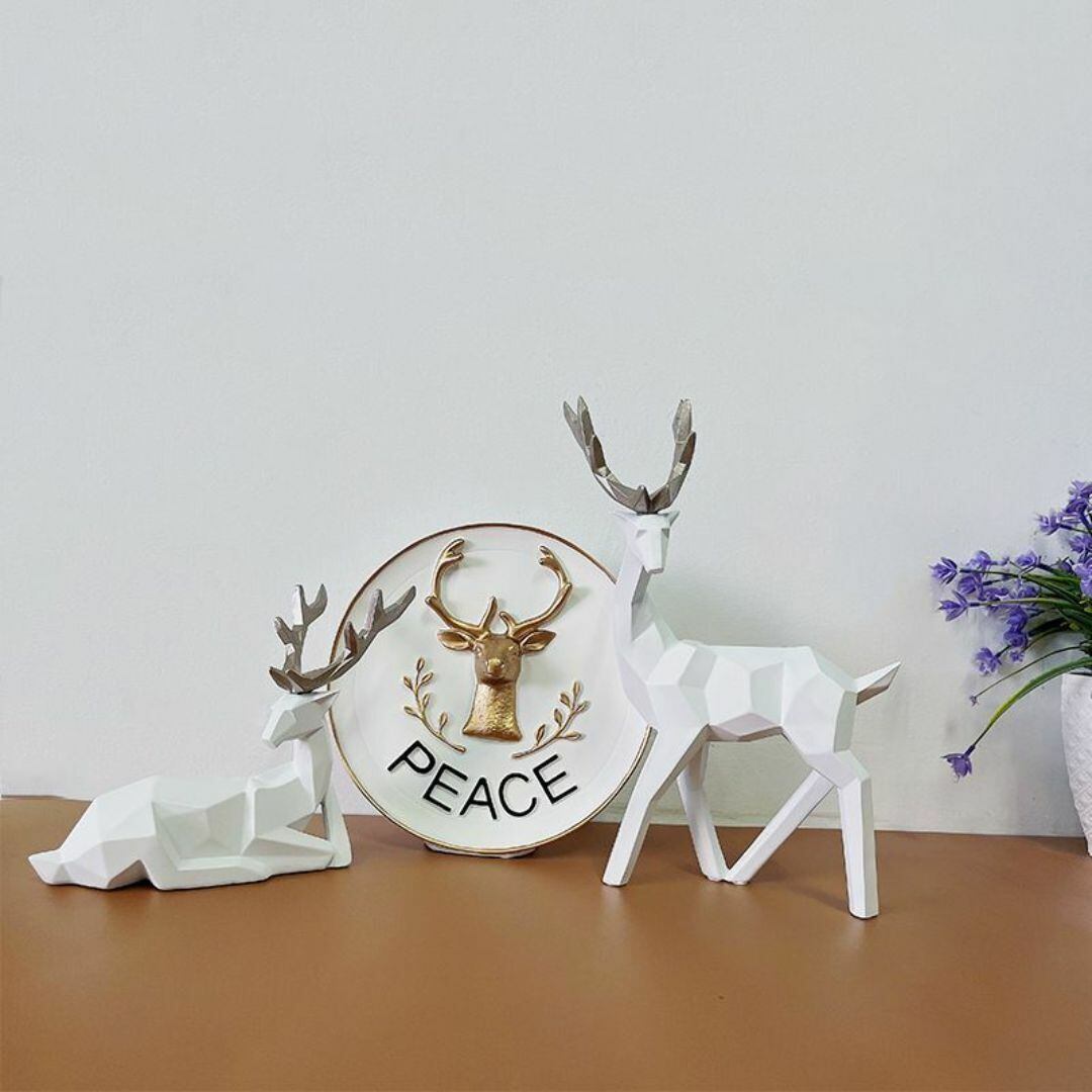 こちらの置物は、金色の角を持つ2匹の鹿をモチーフにした、北欧モダンなデザインのオブジェです。立ち姿と座り姿がセットになっており、繊細で美しいフォルムが特徴です。樹脂製で軽量ながらも高級感があり、玄関やリビングに飾るだけで空間を格上げするおしゃれなアイテムです。カラーバリエーションも豊富で、インテリアの雰囲気に合わせて選べます。プレゼントやギフトにも最適で、季節を問わず楽しめる装飾品として人気の高いオーナメントです。