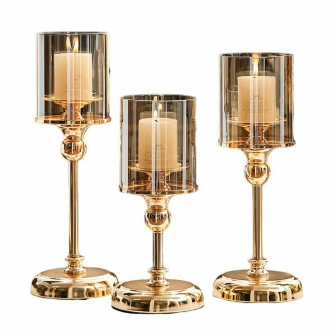 こちらの燭台セットは、ロマンチックな雰囲気を演出するキャンドルライト用のアイテムです。3つの異なるサイズがセットになっており、ゴールドとシルバーの2つのカラーバリエーションからお選びいただけます。ガラスの仕切りが優雅で高級感を引き立て、おしゃれなデザインが特徴です。リビングや寝室、ディナーやパーティの装飾に最適で、特別なひとときを華やかに彩ります。洗練されたデザインはプレゼントにもおすすめで、空間に温かみとスタイルをもたらします。