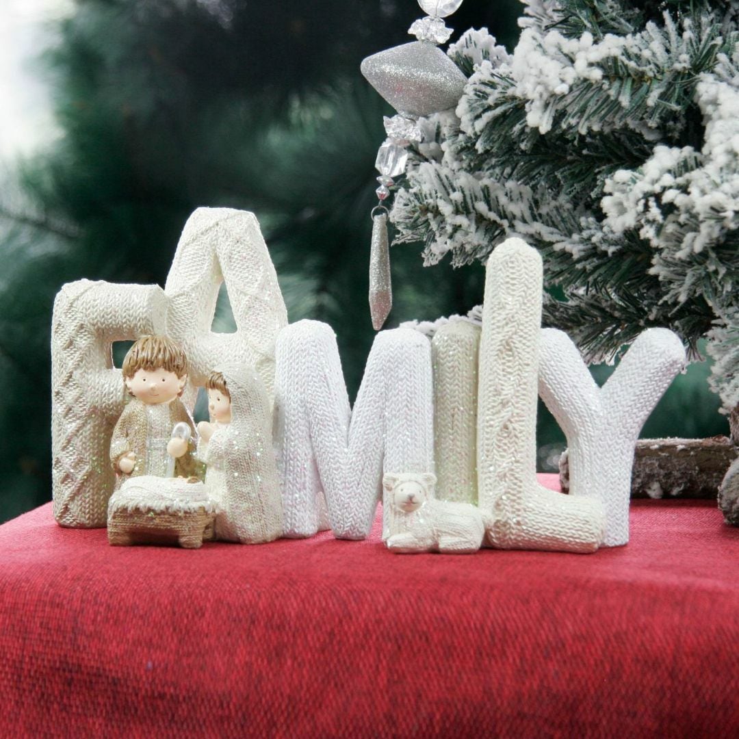 こちらの置物オブジェは、FAMILY、LOVE、PEACE、FAITHの4種類の文字と、寄り添う小人がデザインされた可愛らしいインテリアアイテムです。冬やクリスマスにぴったりな温かみのあるデザインで、玄関やリビングに飾るだけで空間が華やかになります。2つのカラーバリエーションから選べるため、お部屋の雰囲気や好みに合わせて楽しむことができます。樹脂(レジン)素材で繊細に作られており、宗教的なメッセージ性とモダンなデザインを兼ね備えています。ギフトやプレゼントとしても喜ばれる、特別な季節を彩る装飾アイテムです。
