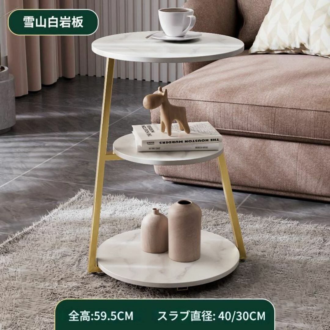 サイドテーブル 円形プレート 3段 ゴールドの脚 ストレートテーブル カラーバリエーション ホワイト リビング ダイニング 寝室 ソファ脇 防水 多機能