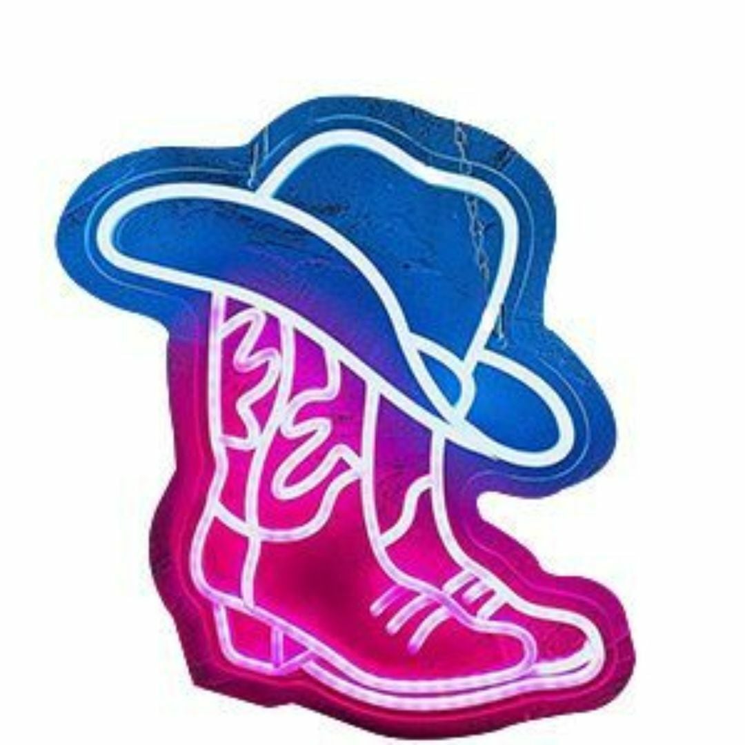 ネオンライト ピンクのウエスタンブーツと水色のカーボーイハット かわいい 西部劇イメージ 壁掛け 発光サイン LED 壁装飾 おしゃれ インテリア 照明 バー 屋内 趣味 ネオンサイン USB給電 電源スイッチあり