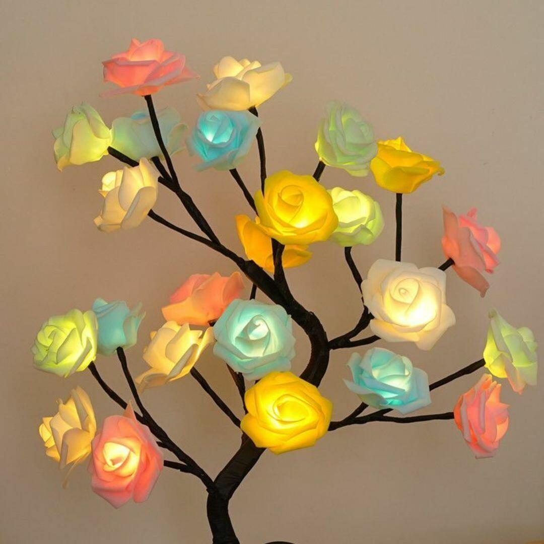 こちらのテーブルライトは、LEDを使用したツリーデザインのカラフルな薔薇の木をモチーフにしたかわいい置物です。ブラックとホワイトの木のカラーバリエーションからお選びいただけ、お部屋のインテリアにぴったりフィットします。鮮やかなカラフルな薔薇が美しく輝き、モダンでおしゃれな空間を演出します。USB充電式で便利にお使いいただけ、玄関やリビングの装飾としてだけでなく、癒しアイテムやプレゼント、ギフトとしても喜ばれるオーナメントです。