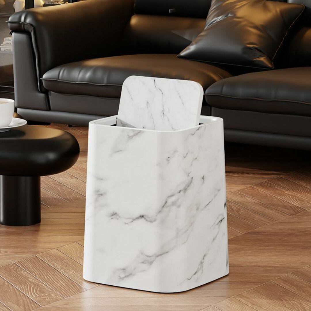 高級感のある大理石柄デザインの蓋つきゴミ箱。正方形のスリムなフォルムで、リビングやトイレ、バスルームなど様々な空間に調和します。360度回転する蓋付きで、ゴミをスムーズに捨てられ、臭いも軽減。12リットル以上の容量を確保し、機能性とデザイン性を兼ね備えています。ブラックとホワイトの2色展開で、インテリアに合わせて選べるおしゃれなトラッシュボックスです。シンプルながらもスタイリッシュな雰囲気を演出します。