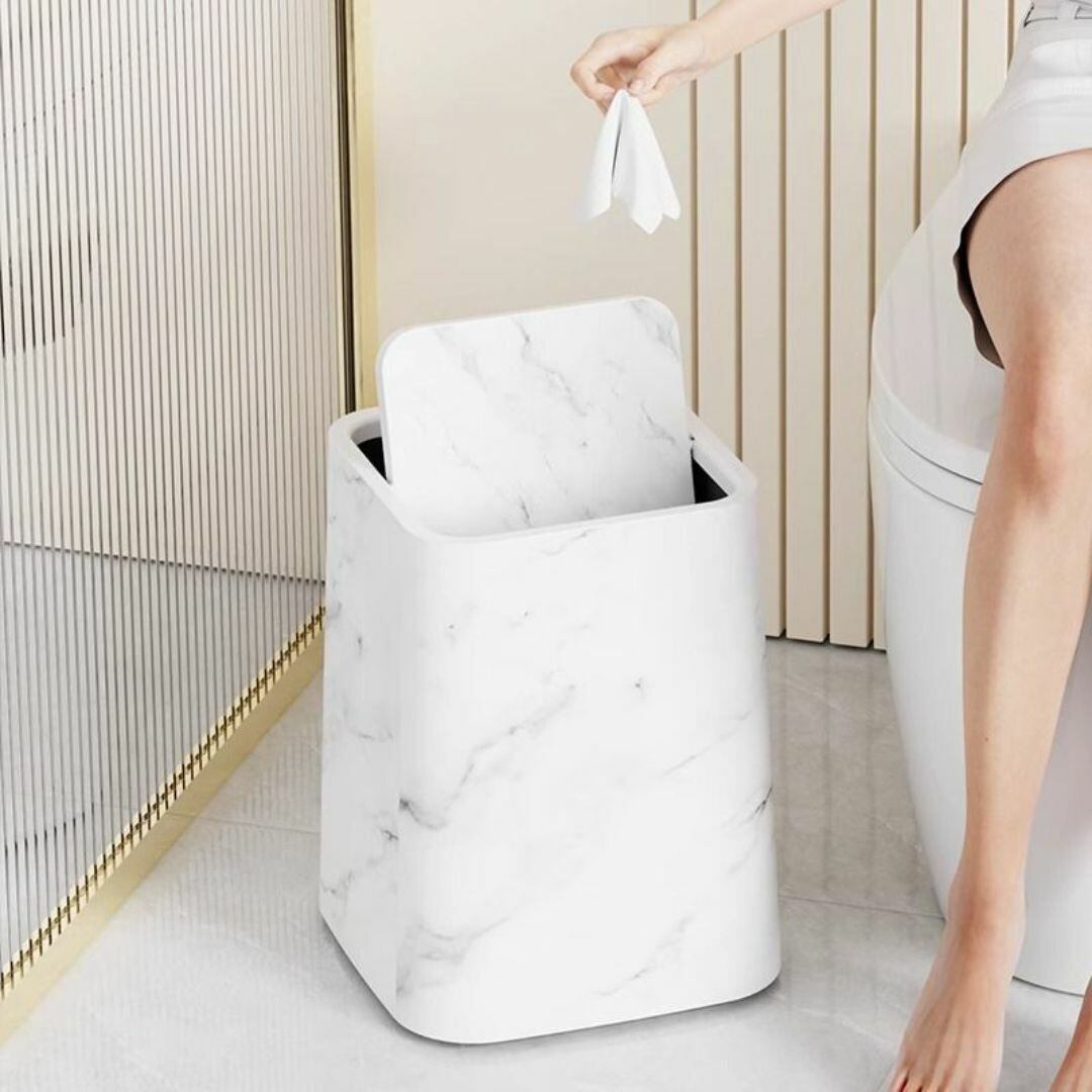 高級感のある大理石柄デザインの蓋つきゴミ箱。正方形のスリムなフォルムで、リビングやトイレ、バスルームなど様々な空間に調和します。360度回転する蓋付きで、ゴミをスムーズに捨てられ、臭いも軽減。12リットル以上の容量を確保し、機能性とデザイン性を兼ね備えています。ブラックとホワイトの2色展開で、インテリアに合わせて選べるおしゃれなトラッシュボックスです。シンプルながらもスタイリッシュな雰囲気を演出します。