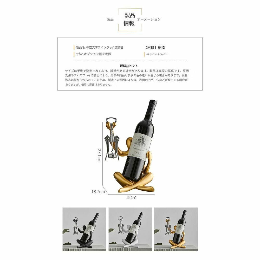 ボトルを抱え、線抜きを持った人型デザインのスタイリッシュなワインラック。ユニークでおしゃれなフォルムが魅力的で、ワインボトルホルダーとしてはもちろん、インテリアオブジェとしても映えます。リビングやキッチン、冷蔵庫のそばに置くだけで、空間をおしゃれに演出。ゴールド、ブラック、ホワイトの3色展開で、お好みに合わせて選べます。実用性とデザイン性を兼ね備えた、ワイン好きにぴったりのアイテムです。