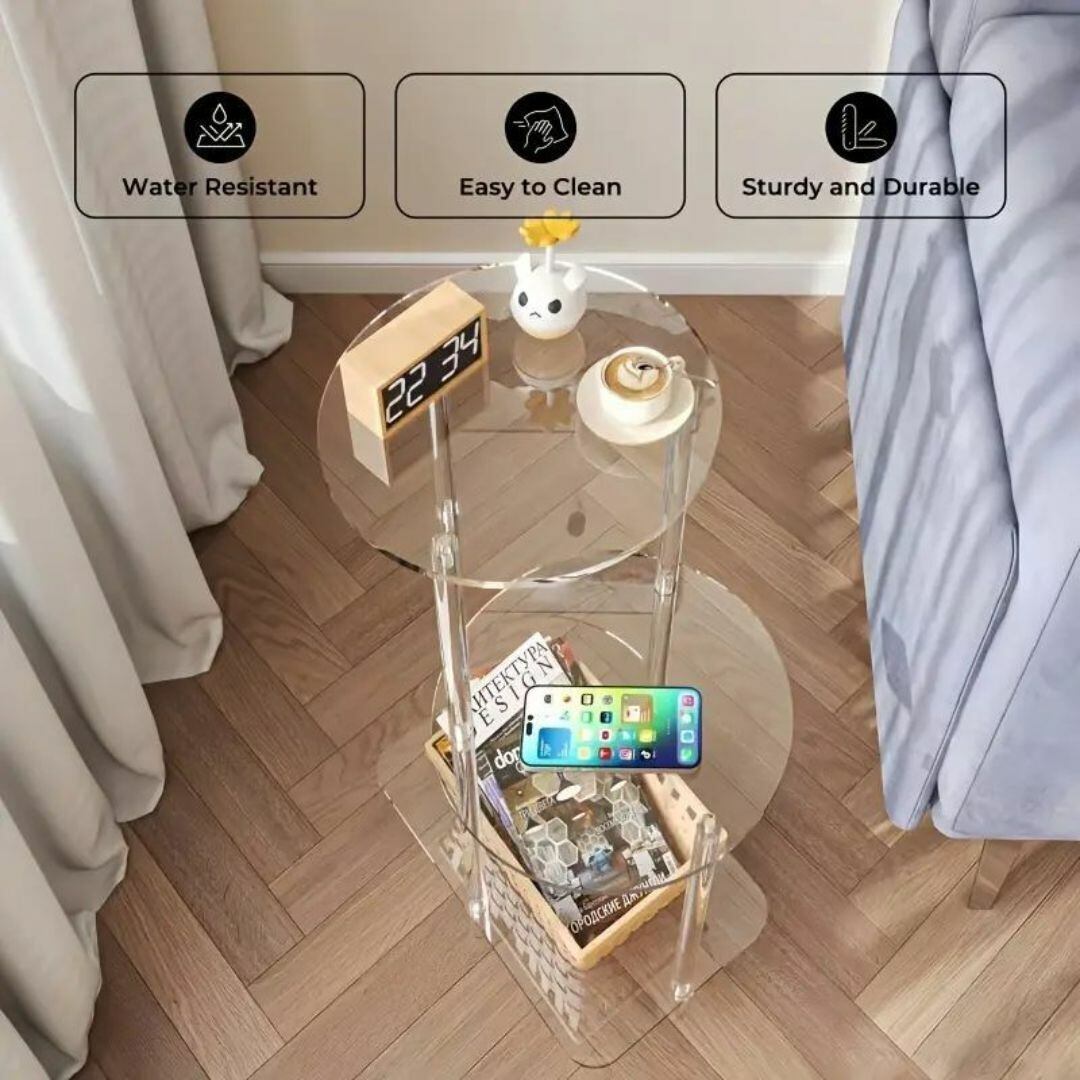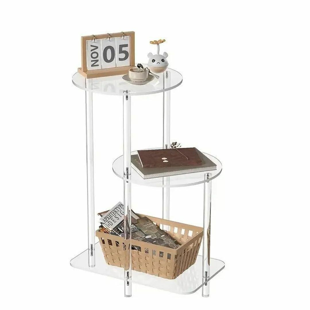 円形と正方形が組み合わさった、ユニークなデザインの三段収納ラック。クリアなアクリル素材がスタイリッシュで、おしゃれな空間を演出します。透明なデザインで圧迫感がなく、キッチンやリビングに馴染みやすいのも魅力。本や食品、小物の収納に便利で、多機能に活躍。シンプルながら個性的なフォルムが映える、おしゃれなストレージラックです。