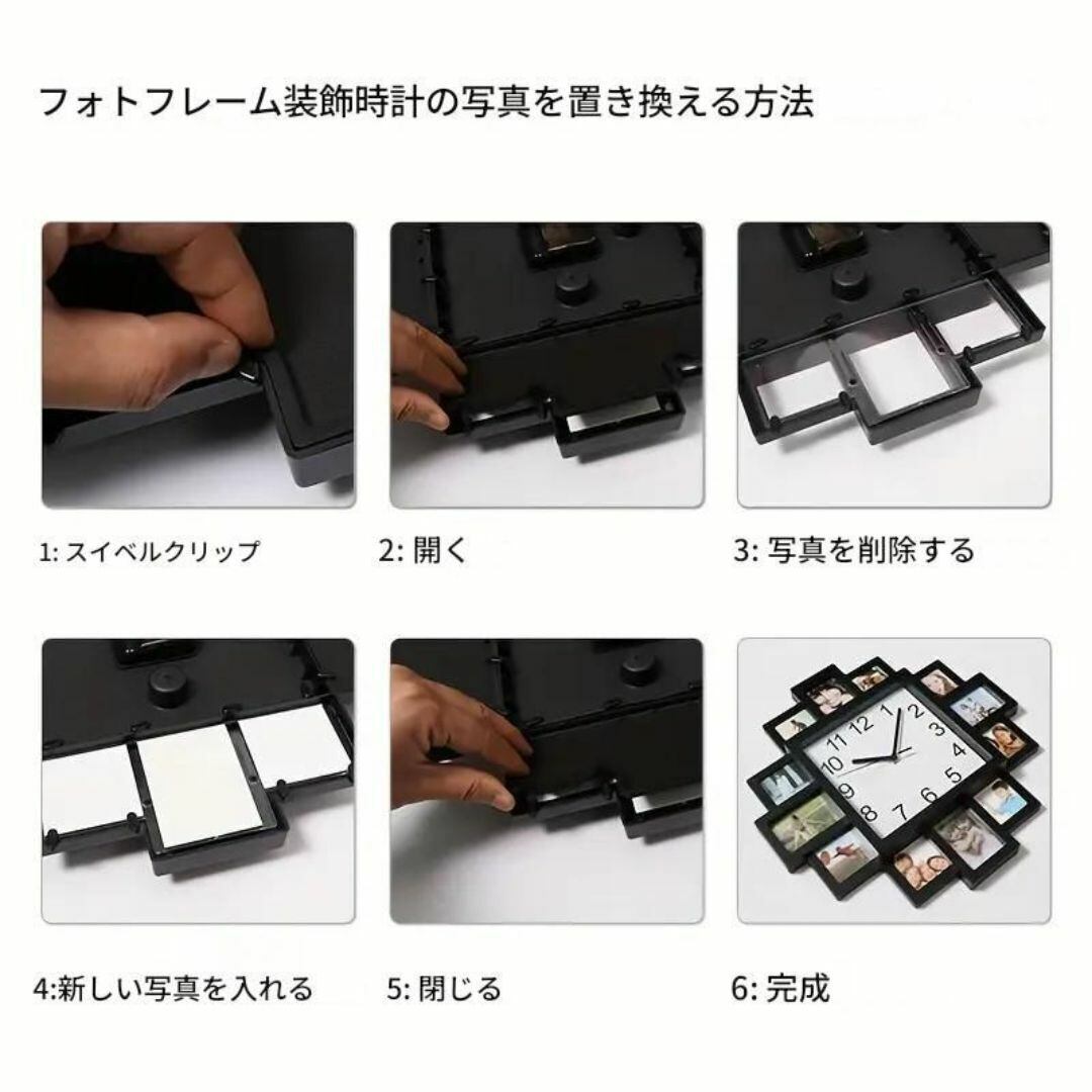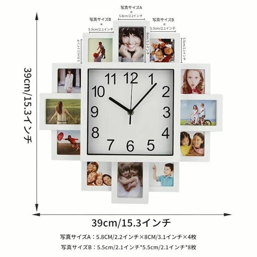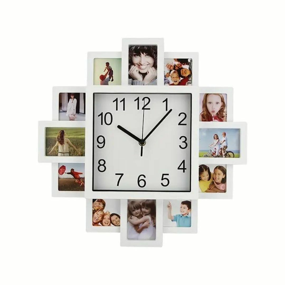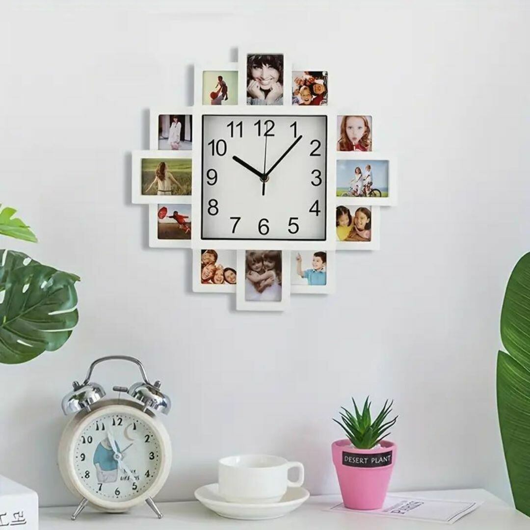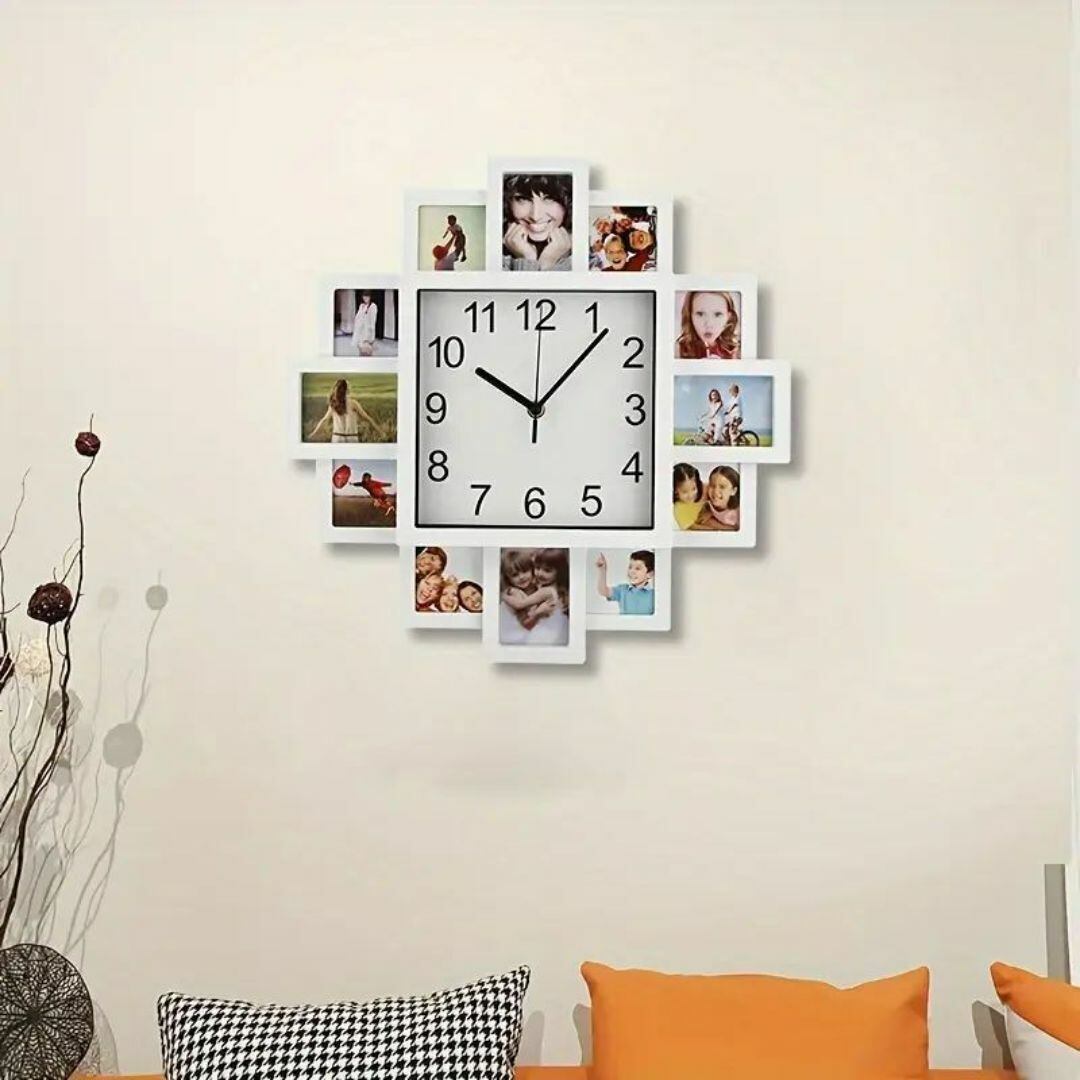 壁時計 ウォールクロック 正方形 12枚分のフォトフレーム枠 北欧 白 ホワイトおしゃれ 掛け時計 壁掛け時計 ファッション モダン 静音 アナログ クリエイティブ クール シンプル リビングルーム 寝室 書斎 オフィス
