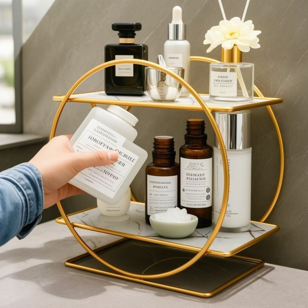 リング型の柱が特徴的なテーブル用収納ラック。大理石柄の台座が高級感を演出し、インテリアとしても映えるおしゃれなデザインです。ブラックとホワイトの2色展開で、リビング、キッチン、寝室、バスルーム、洗面台など、さまざまな場所で活躍。取り外し可能な構造で、多機能に使えるのも魅力です。コスメ収納やアクセサリー、日用品の整理にも便利なスタイリッシュなコスメラックです。