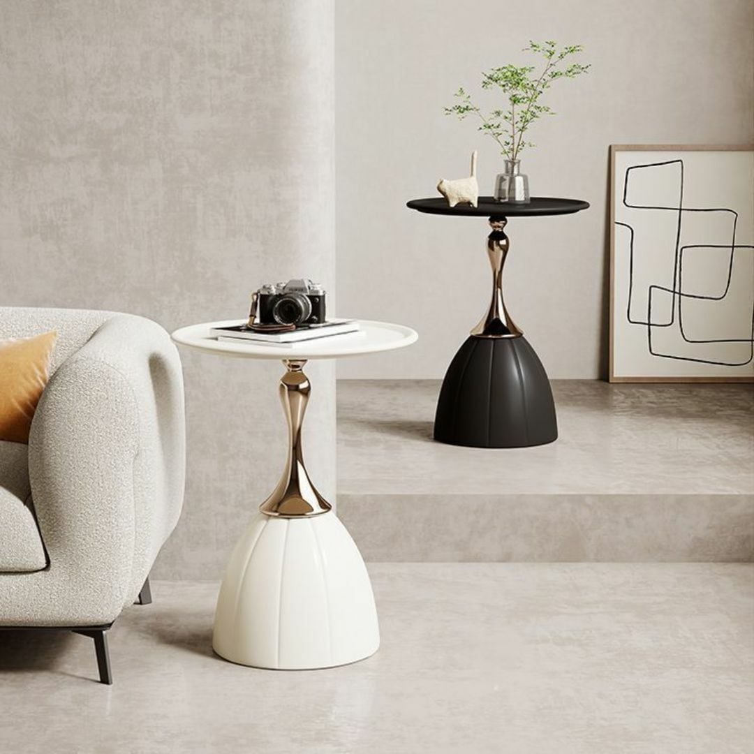 丸プレートと金の脚が特徴的なエレガントなサイドテーブル。シンプルながら洗練されたデザインで、カフェやリビング、寝室、書斎、ホテル、オフィスなど、さまざまな空間にマッチします。高さ50cmの機能的なサイズ感で、コーヒーテーブルとしても最適。モダンでおしゃれな雰囲気を演出しながら、実用性も兼ね備えています。カラーバリエーションはホワイトとブラックの2色展開。