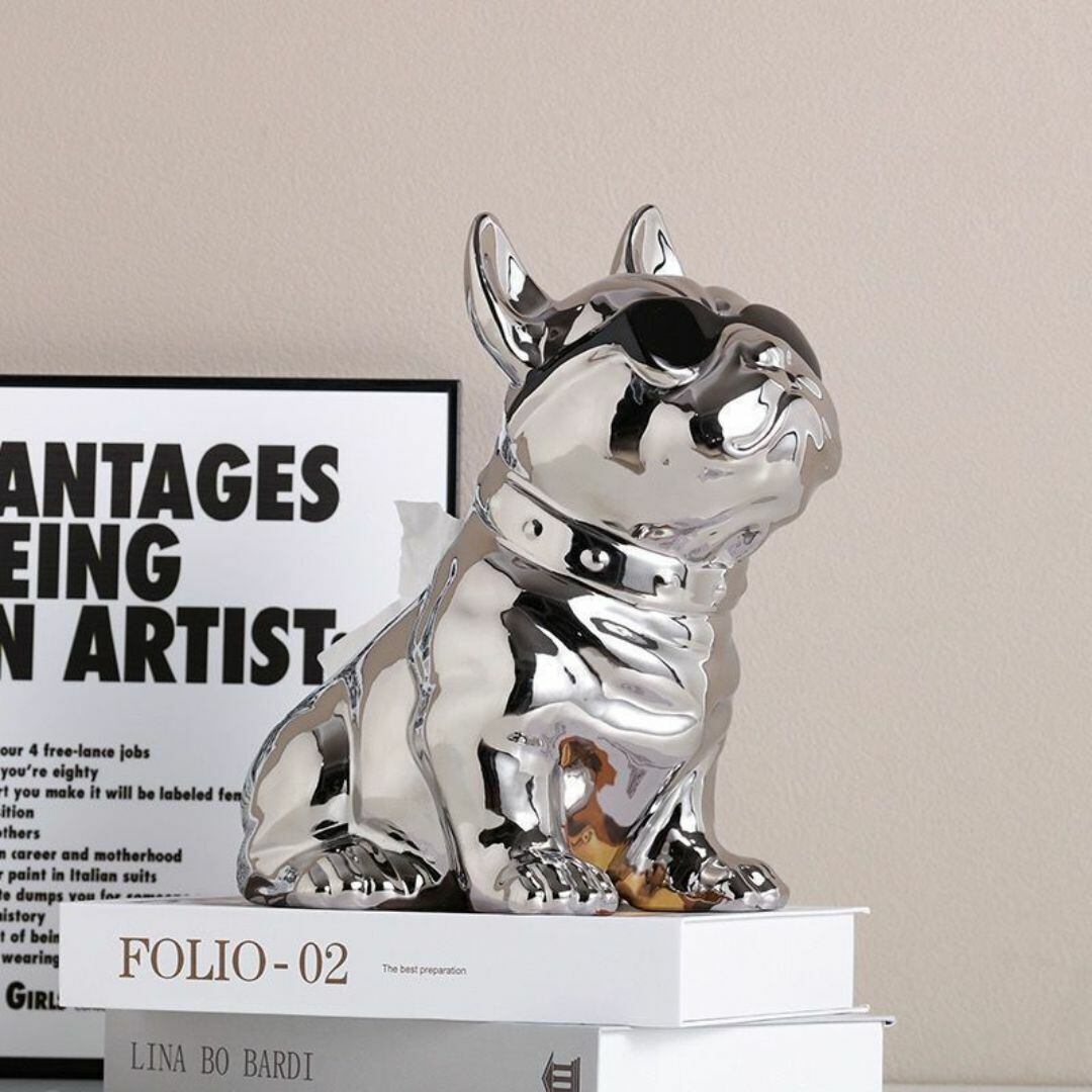 ブルドッグの形をしたユニークなティッシュボックス。背中からティッシュを引き抜くデザインで、インテリアとしても楽しめるおしゃれなアイテムです。リビングや寝室、車内収納にもぴったり。樹脂製で丈夫な作りになっており、実用性とデザイン性を兼ね備えています。カラーバリエーションはシルバーとゴールドの2色展開。