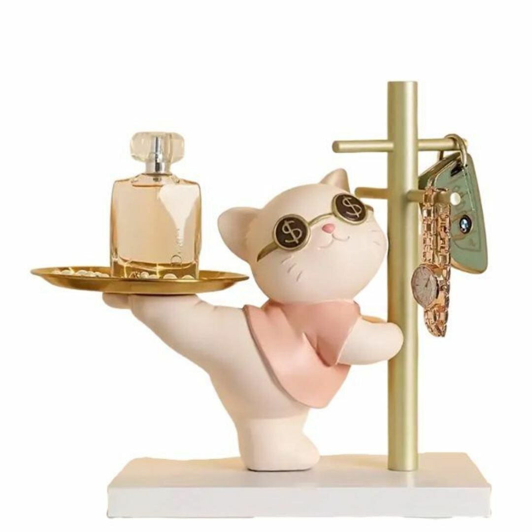 サングラスをかけたおしゃれなネコが金色のトレイと引っかける棒を持ったユニークな小物入れ。鍵やアクセサリー、ちょっとした小物を置くだけでなく、棒にはメガネや腕時計を掛けることができる実用的なデザインです。リビングや寝室のインテリアにぴったりで、プレゼントやギフトにも最適。カラーバリエーションはピンク、ゴールド、グレーの3色展開。