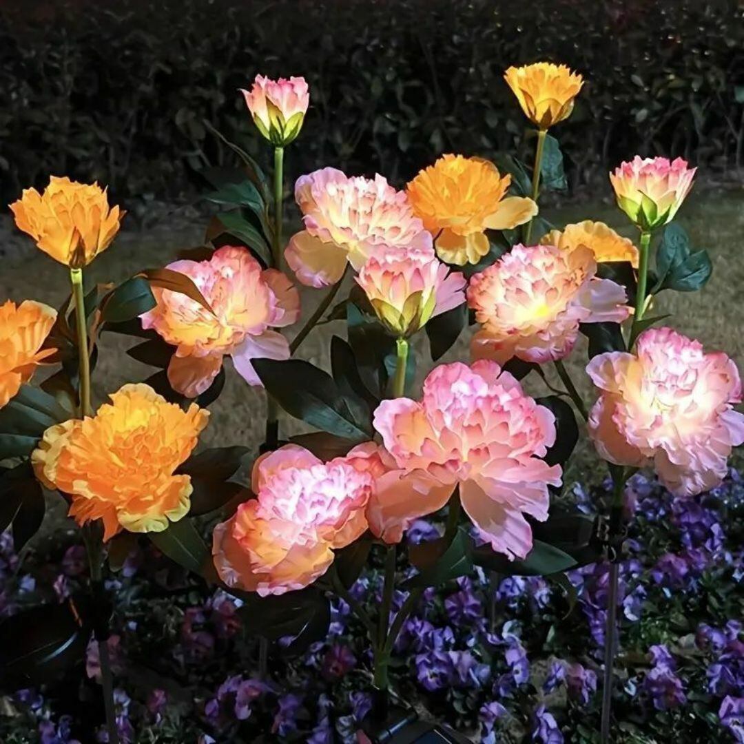 ピオニーの花をモチーフにしたカラフルなガーデンライト。ブルー、ピンク、イエロー、ホワイトのカラーバリエーションで、庭やガーデンを華やかに彩ります。ソーラー充電式で電源不要、環境に優しく防水仕様で屋外でも安心して使用でき、おしゃれでかわいいデコレーションライトとしてイベントや特別な空間作りに最適です。