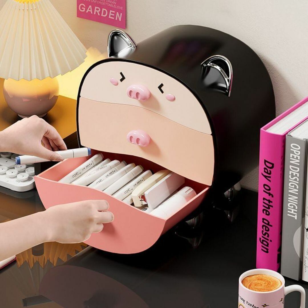 愛らしいブタさんのデザインが特徴的な、引き出しタイプの3段収納ボックス。目をつぶったブタの表情が癒しを与え、おしゃれでかわいいインテリアアイテムとしてリビングや寝室にぴったり。円形フォルムが柔らかな印象を与え、コンパクトながら収納力も抜群。アクセサリーやコスメ、小物類の整理に便利です。カラーバリエーションはホワイトとブラックの2種類をご用意。機能性とデザイン性を兼ね備えた、実用的で可愛らしい収納ボックスです。