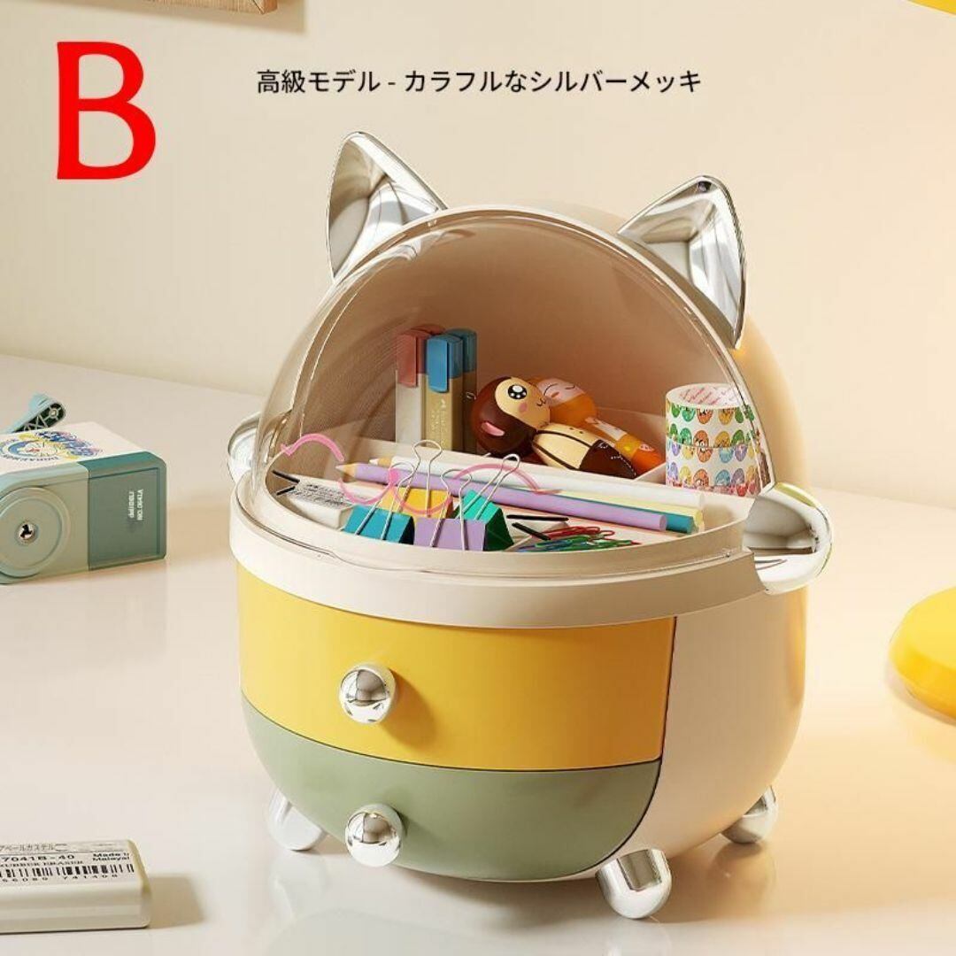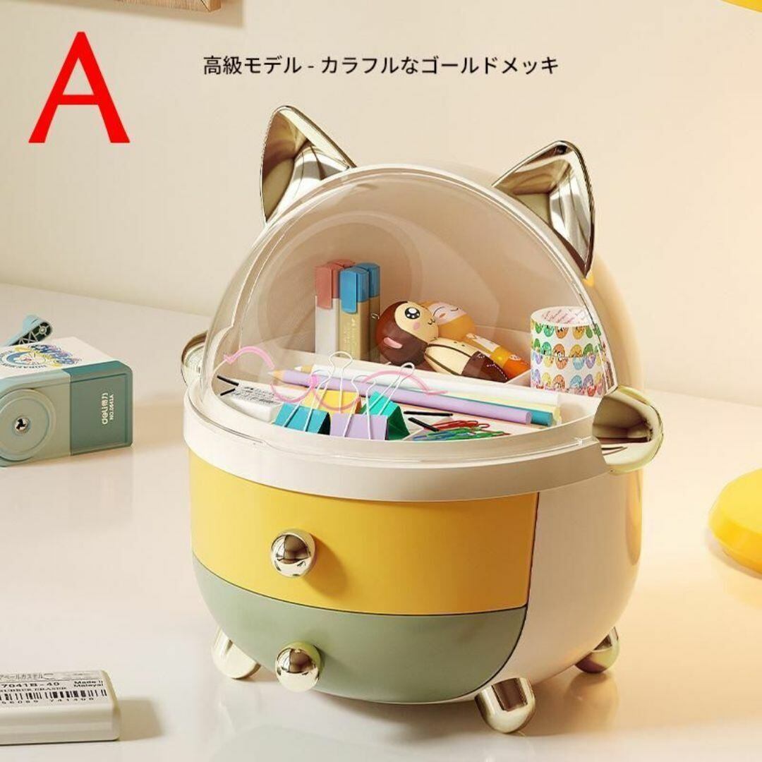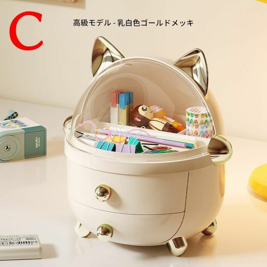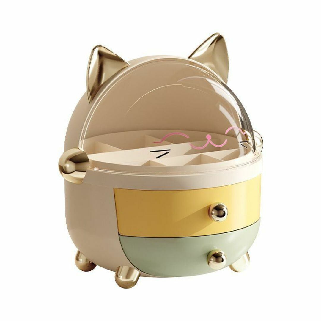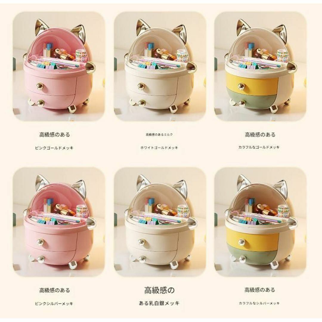 小物入れ 下段2段の引き出し 上段仕切り付き小物入れ 透明の蓋 収納ボックス かわいい おしゃれ ネコのデザイン ネコ耳 ドーム形 カラーバリエーション 耳の色 ゴールド シルバー 本体の色 カラフル ホワイト ピンク リビング 寝室 多機能