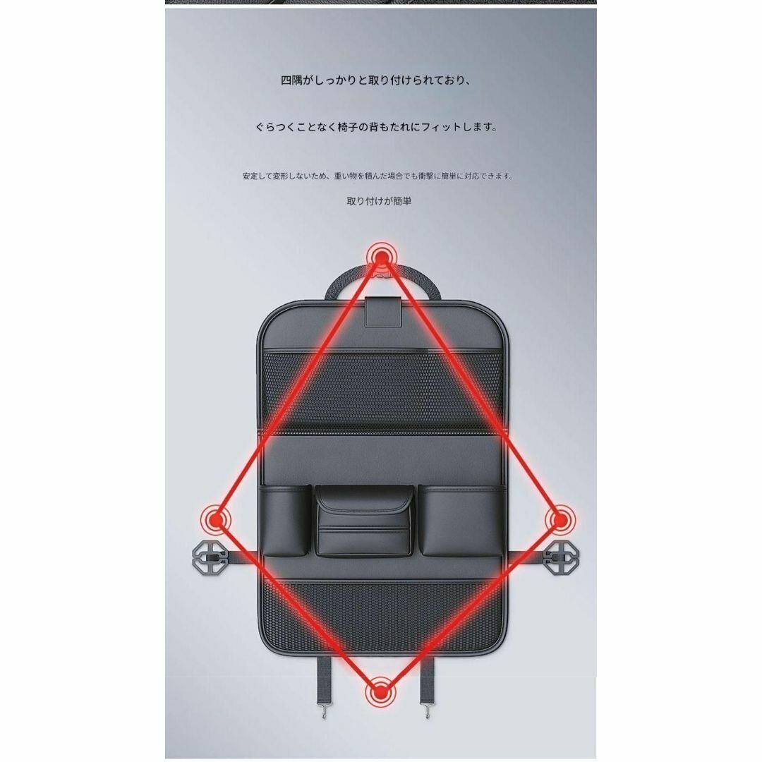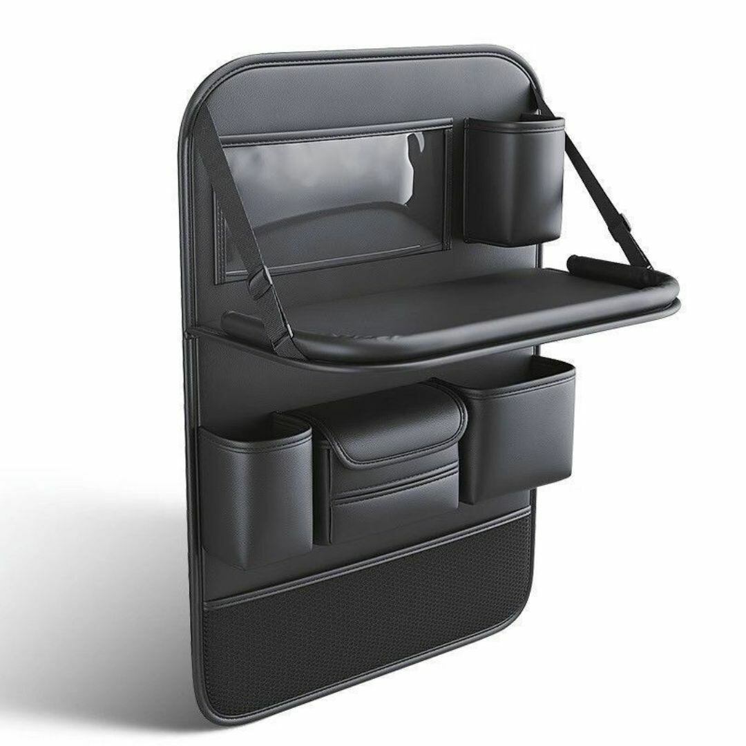 車内アクセサリーとして便利な、後部座席用の多機能収納ラック。ボトルホルダー付きで、飲み物を安定して収納可能。折りたたみ式テーブルが備わっており、スマートフォンやパソコンを置いて作業や食事も快適に。高級感のあるレザー素材を使用し、車内の雰囲気を損なわずにおしゃれに演出。前の席にぶら下げるだけで簡単に取り付け可能。たくさんのポケットで、小物や雑誌などを整理整頓しやすい実用的なアイテムです。