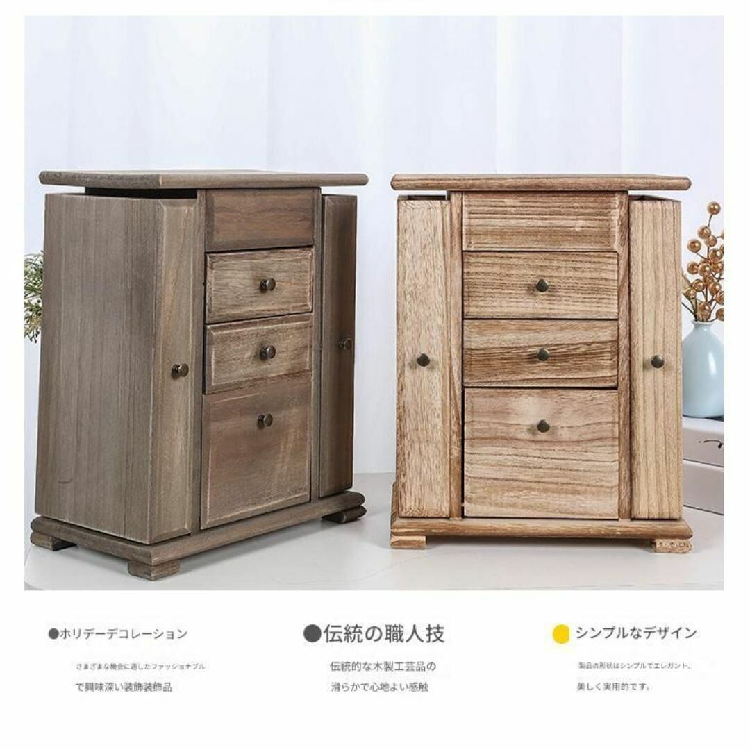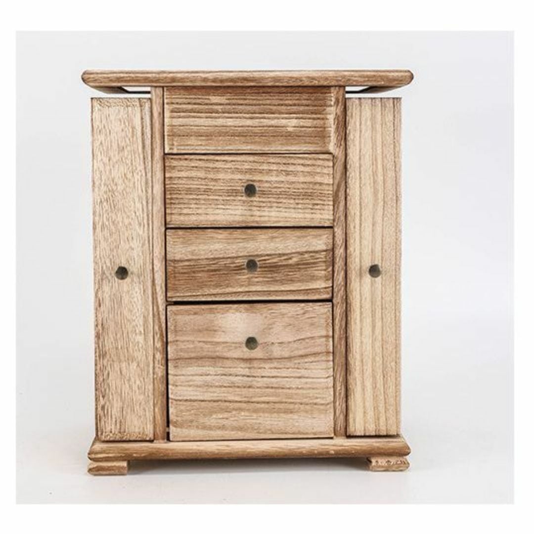 エレガントで実用的なジュエリーボックス。2段の引き出しに加え、指輪専用収納スペースや観音開きのネックレス掛けを備え、大切なアクセサリーを整理整頓できます。内蔵ミラー付きで、お出かけ前のコーディネート確認にも便利。木製の温かみのあるデザインで、インテリアにも馴染みます。カラーバリエーションはライトブラウン、ブラウン、ブラックの3色展開。多機能で使いやすいアクセサリー収納アイテムです。