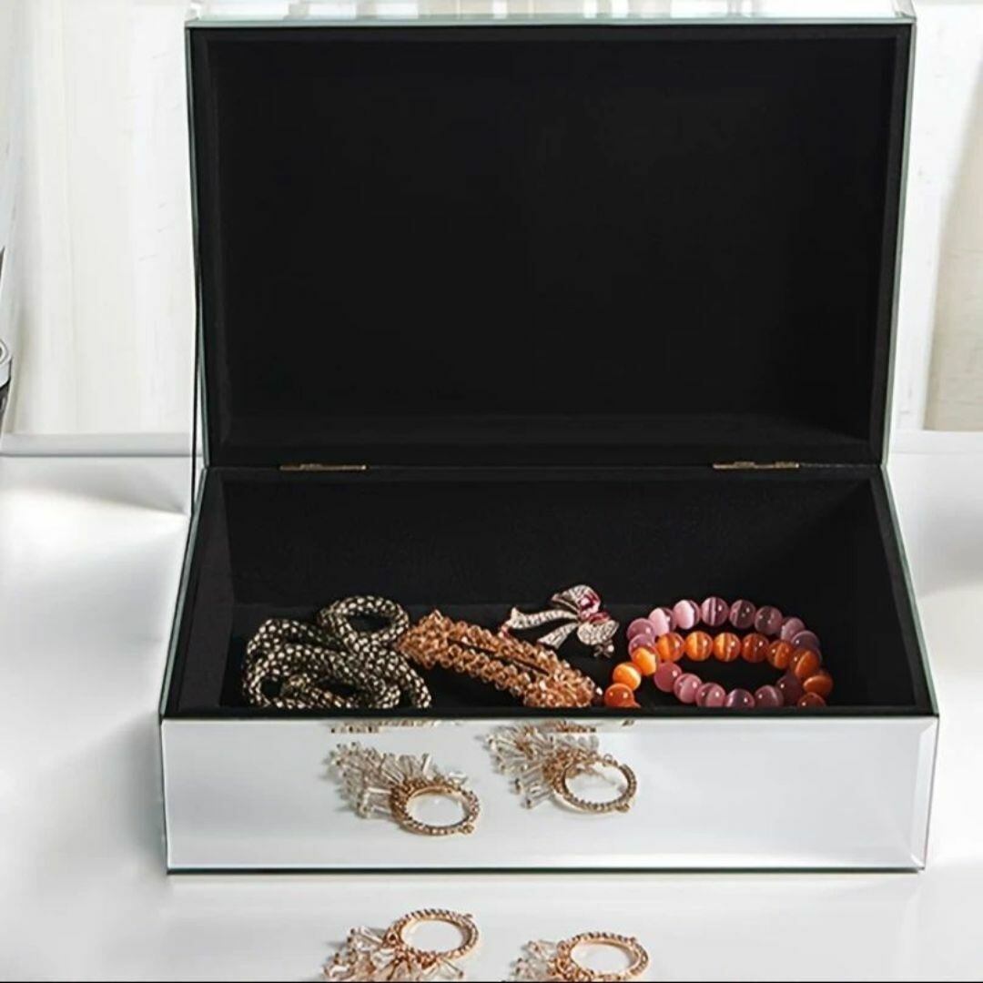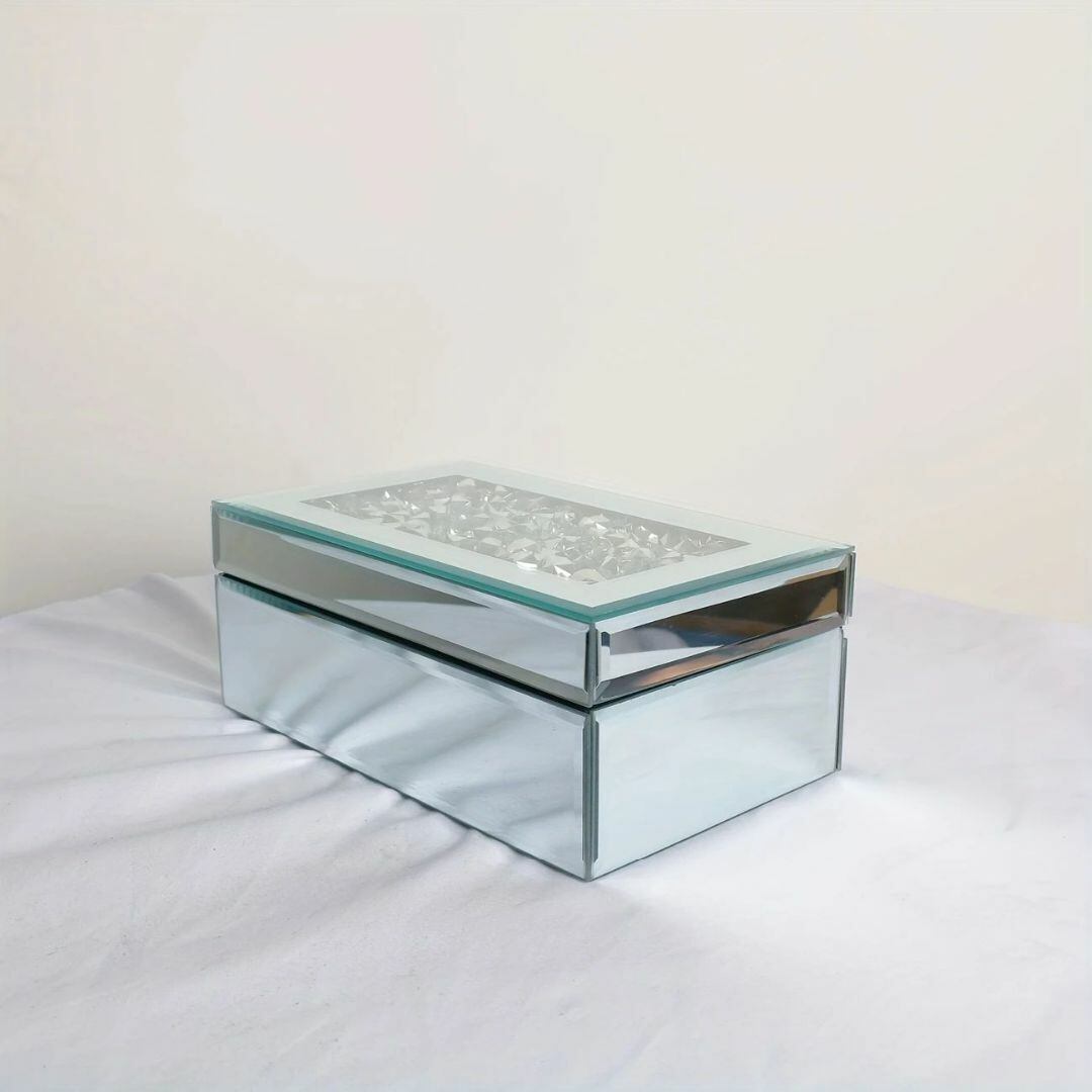 ゴージャスでエレガントなジュエリーボックス。きらきら輝くガラス素材と、ミラー上の装飾が華やかさを演出。長方形デザインで収納力が高く、大切なアクセサリーや小物を美しく整理できます。シルバーカラーが上品な雰囲気を醸し出し、インテリアとしても映えるアイテム。女性向けの特別なギフトにもぴったりな、おしゃれで実用的な収納箱です。
