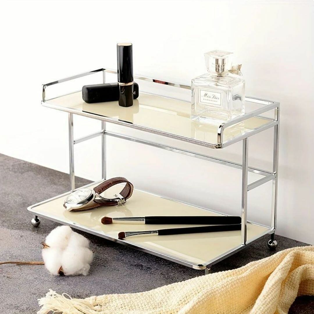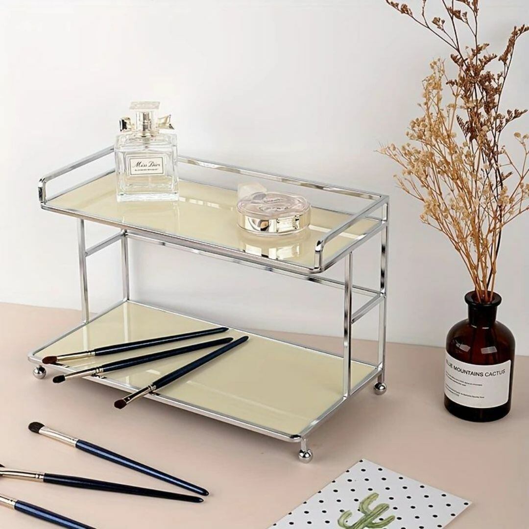 シンプルでスタイリッシュな2段式のコスメ収納ラック。下段の台座が広めに設計されており、ボトル類やスキンケア用品などの高さのあるアイテムもすっきり収納可能。デスクや洗面台の上でも圧迫感がなく、見た目もおしゃれで実用性も抜群です。アクリル素材で清潔感があり、お手入れも簡単。ホワイトとブラックのカラーバリエーションがあり、リビング、キッチン、寝室、バスルームなど、さまざまな空間にマッチします。