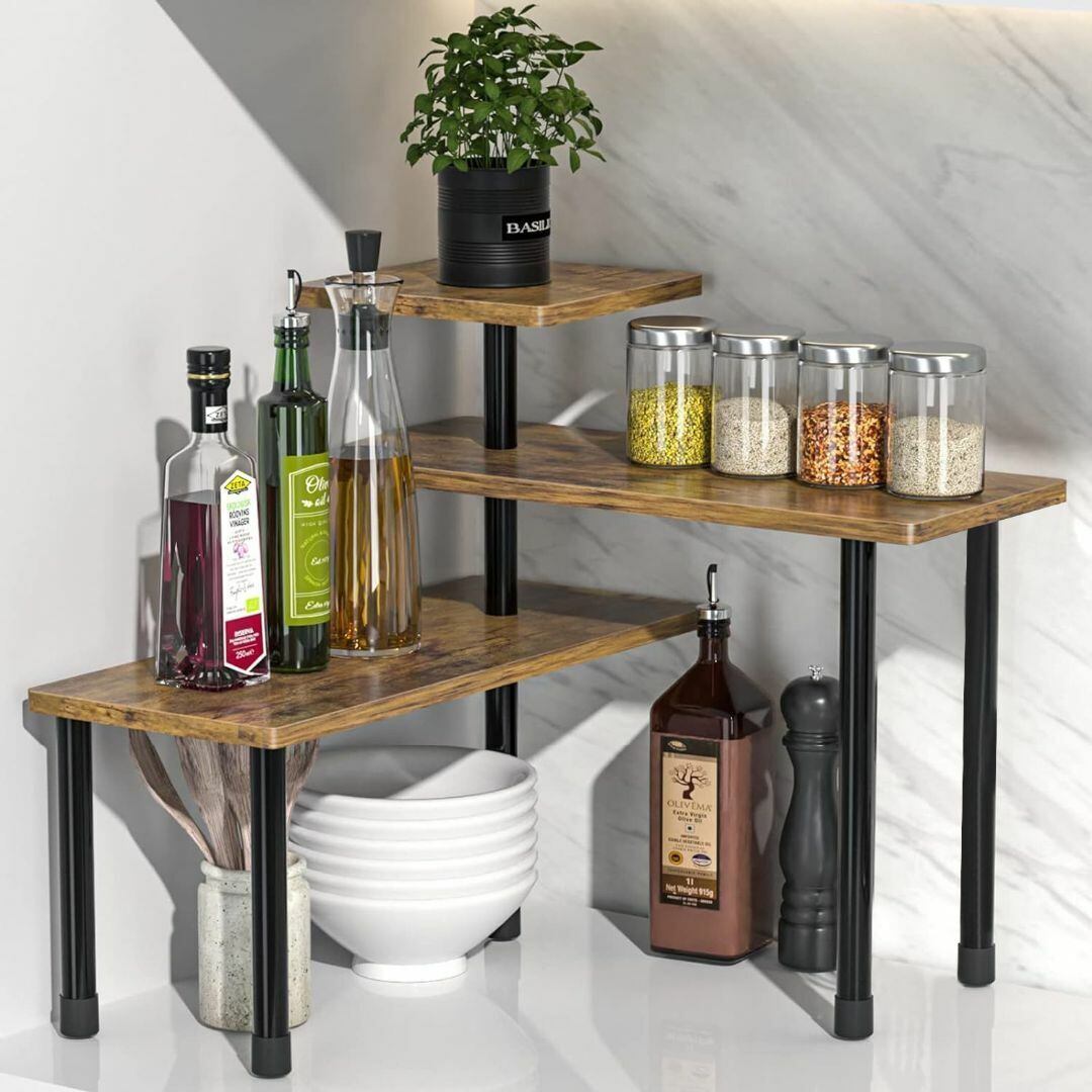 シンプルでおしゃれな木製保存棚。多様な可変機能を搭載した3段構造で、テーブル上に置いてキッチン、リビング、洗面台、バスルームなど、さまざまなシーンで活躍します。調味料やコスメ、各種小物を効率的に収納でき、フック付きでアクセサリーや雑貨の追加収納も可能。スタイリッシュなブラウンカラーが温かみを演出し、インテリアに落ち着きを与える便利かつ多機能な収納アイテムです。