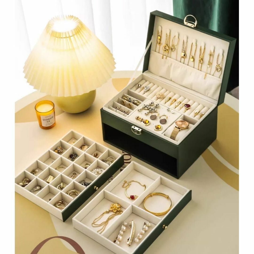 ジュエリーボックス アクセサリー 収納棚 2段の引き出し 鍵付き 指輪収納スペース おしゃれ 多機能 カラーバリエーション ホワイト ブラック グリーン 小物入れ PUレザー