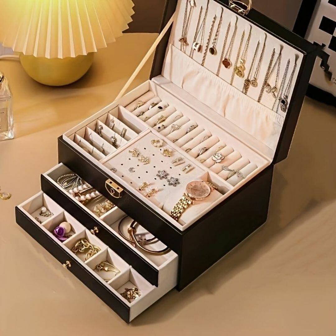 ジュエリーボックス アクセサリー 収納棚は、上品なPUレザー仕上げで高級感と実用性を兼ね備えたアイテムです。2段の引き出しに加え、指輪専用の収納スペースも備えており、大切なアクセサリーを整理整頓しながら美しく保管できます。鍵付きなので、防犯性もあり安心。