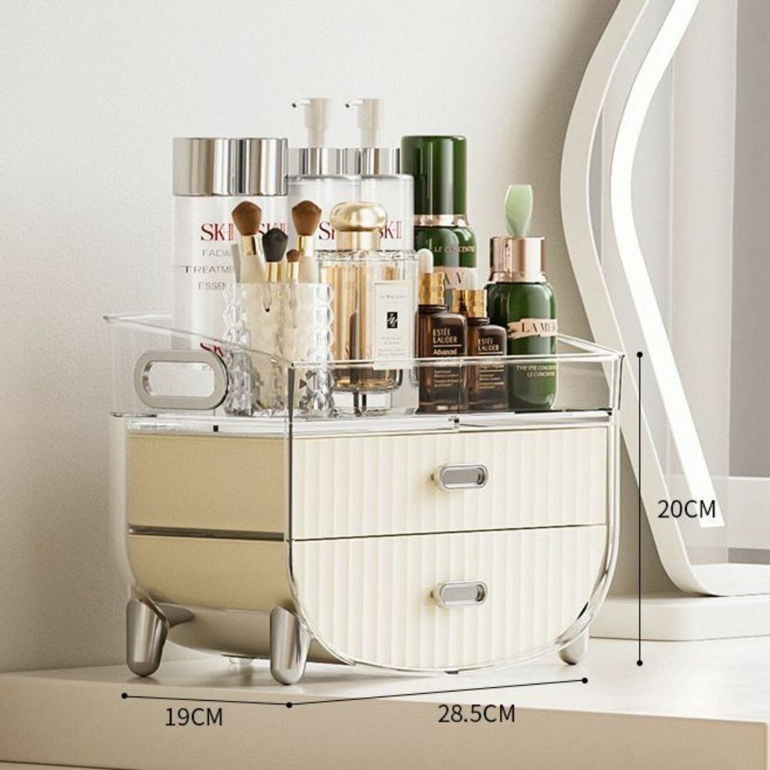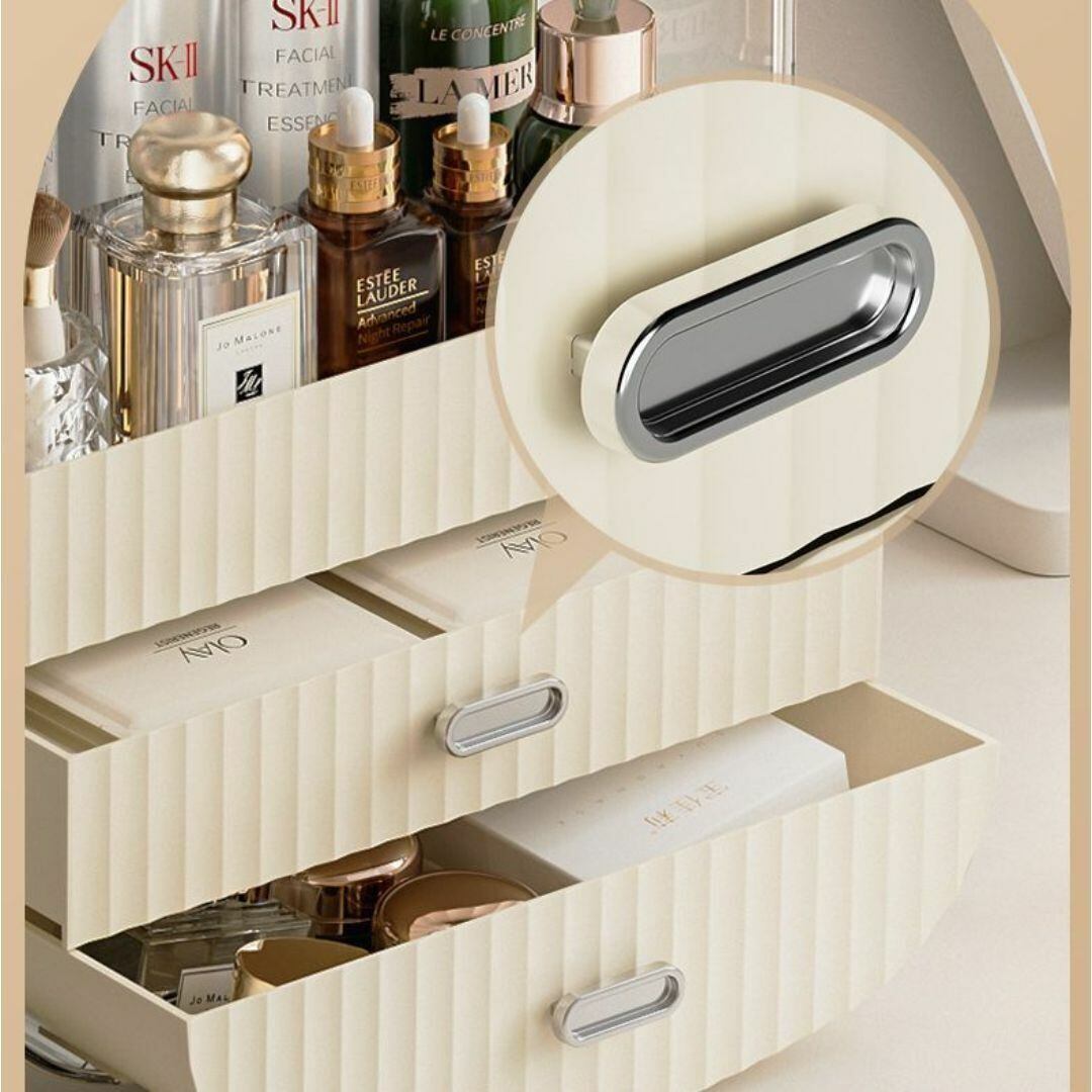 ボトル収納に便利な上部スペースと、多数の小物入れを備えた多機能コスメ収納ボックス。2つの引き出し付きで、リップやアクセサリー、メイク小物をすっきり整理できます。ホワイトカラーのシンプルでかわいいデザインが、ドレッサーやテーブル上をおしゃれに演出。大容量ながらコンパクトにまとまり、毎日のメイクタイムを快適にサポートします。