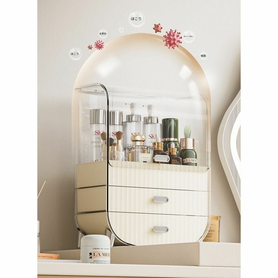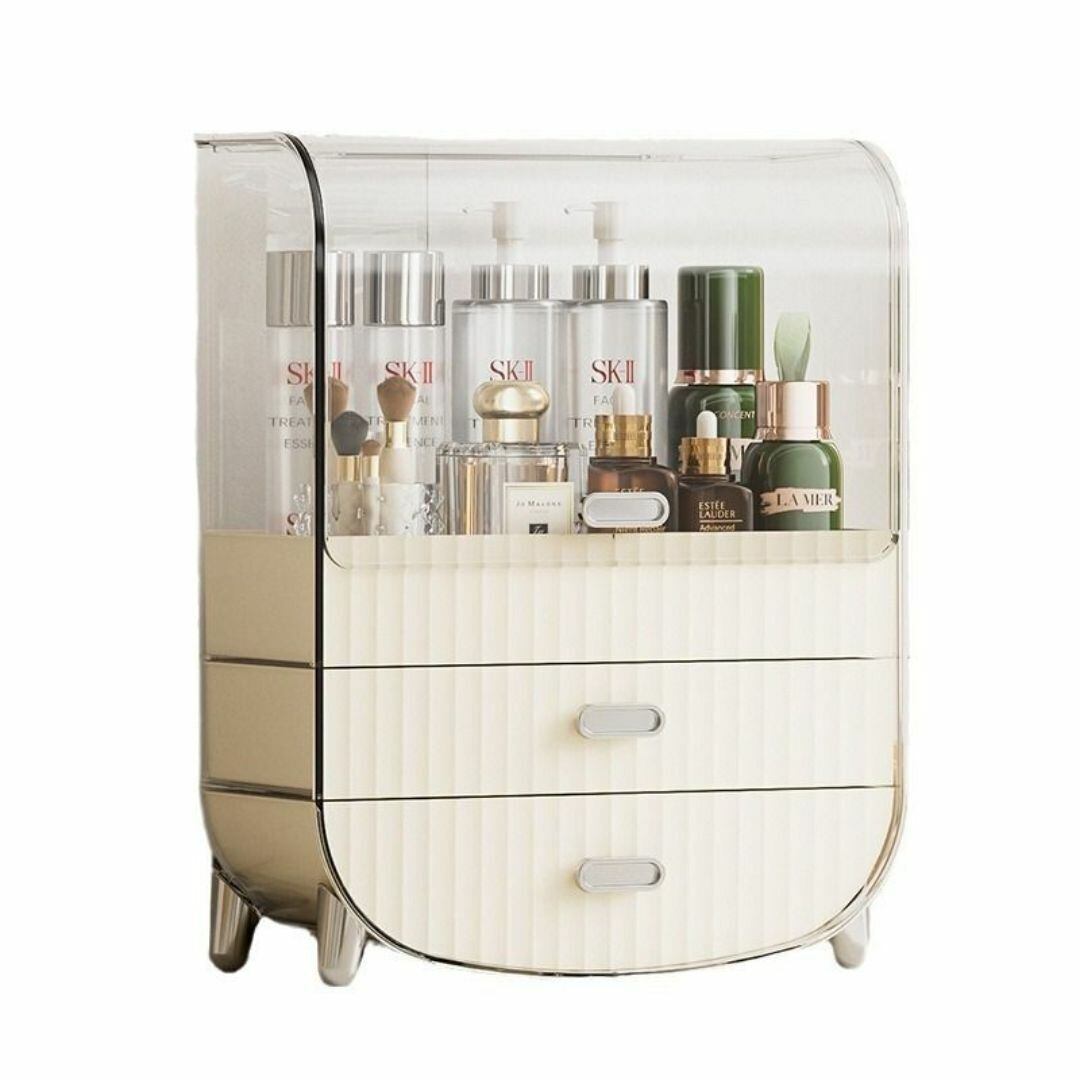 ボトル収納に便利な上部スペースと、多数の小物入れを備えた多機能コスメ収納ボックス。2つの引き出し付きで、リップやアクセサリー、メイク小物をすっきり整理できます。ホワイトカラーのシンプルでかわいいデザインが、ドレッサーやテーブル上をおしゃれに演出。大容量ながらコンパクトにまとまり、毎日のメイクタイムを快適にサポートします。