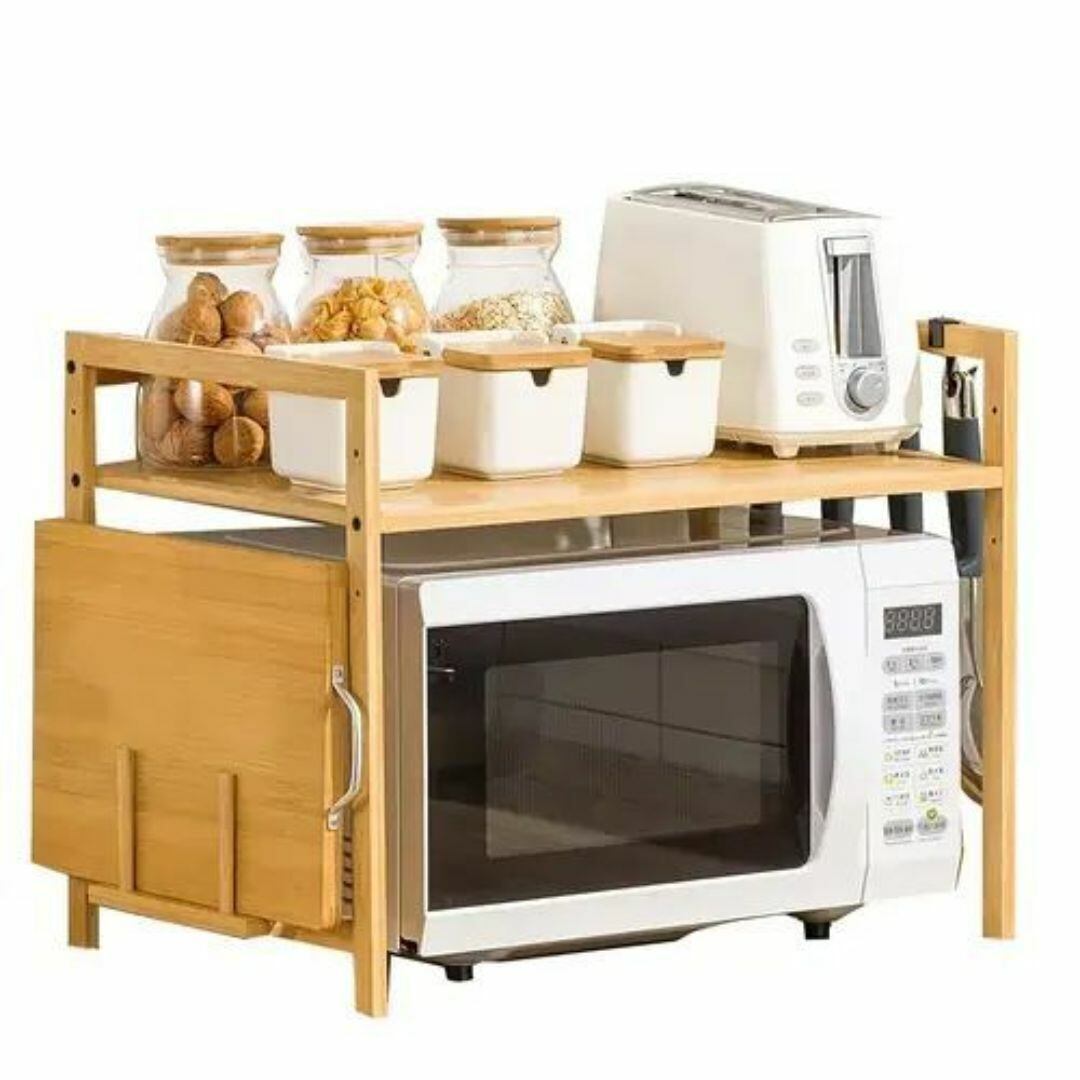 電子レンジやまな板を収納できる多機能キッチンラック。ナチュラルな竹素材を使用し、上部には便利な棚付きで調理器具や小物もすっきり整理。側面にはフックが4つ付属し、ツールの収納にも対応。ベージュとブラウンのカラーバリエーション、安定感のある設計で、キッチンをおしゃれに整える実用的なアイテムです。