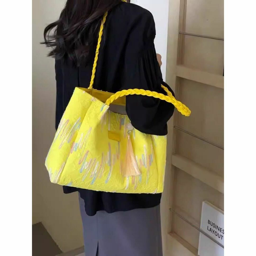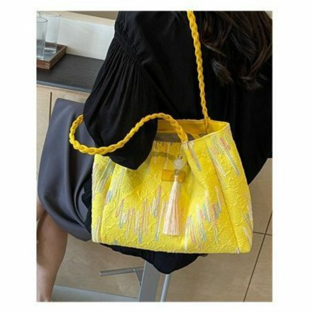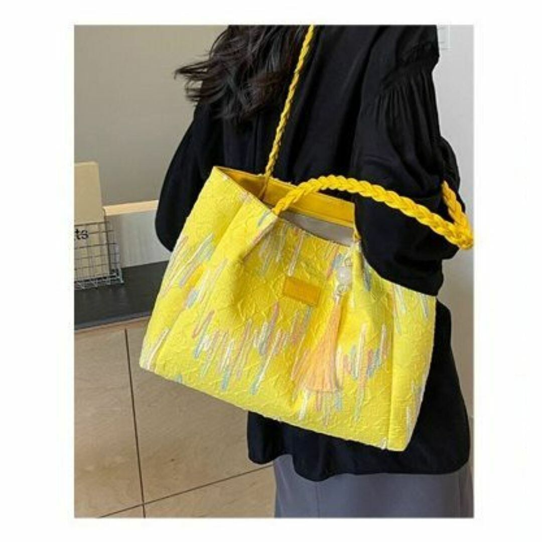 トートバッグ レディース おしゃれ かわいい カラフルなスティッチ模様 チャーム付き 内ファスナー 大容量 カラフルなカラーバリエーション 学生 仕事 旅行 ショッピング ビジネス 買い物 多機能 カジュアル 布製 イエロー 黄色