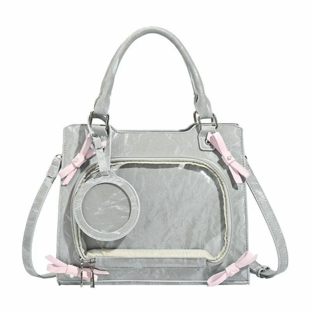 ショルダーバッグ ハンドバッグ レディース オタクバッグ 趣味 中が見えるポケット おしゃれ かわいい 推しの画像を入れる円形の窓ストラップ付き リボンの装飾 カラーバリエーション 旅行 ショッピング デート 推し活 グレー