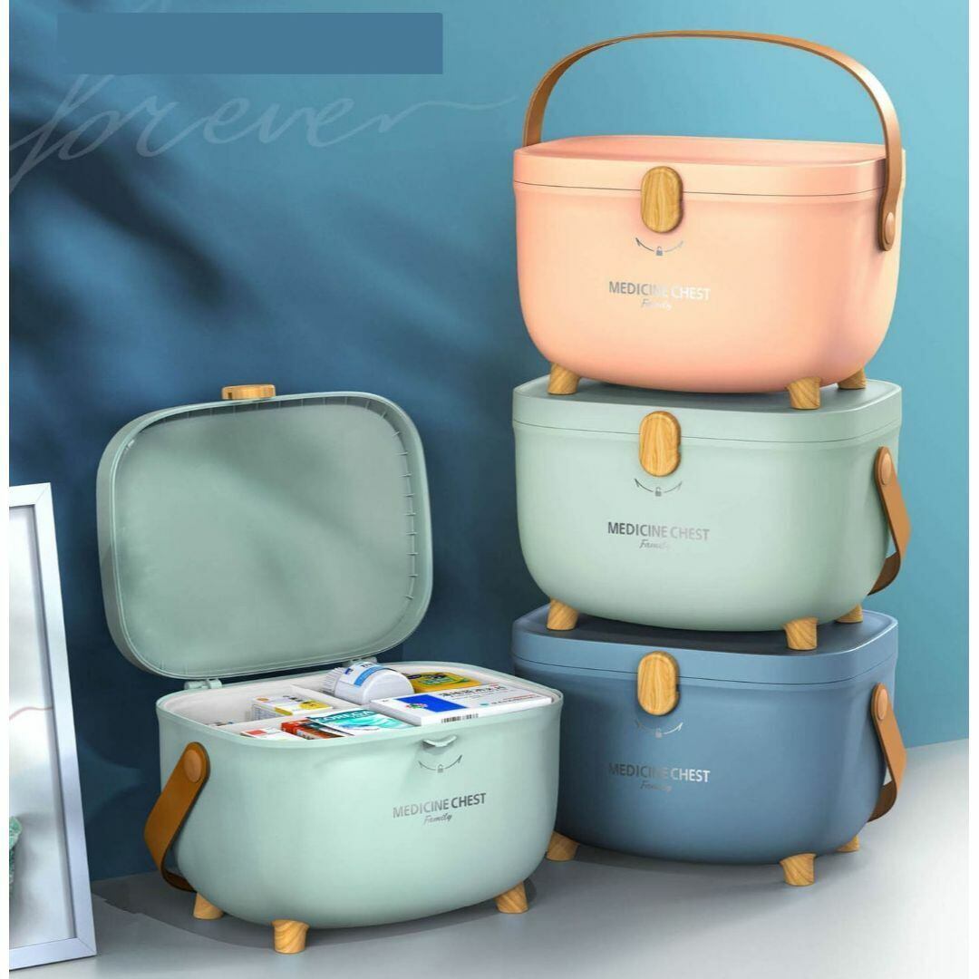 持ち運びに便利な収納ボックスタイプの薬箱。取り外し可能な仕切り付きトレイで、小物や薬をすっきり整理できます。防水仕様のプラスチック素材を使用し、日常使いにも安心。かわいくおしゃれなデザインで、皮の持ち手がアクセントに。360度回転ストッパー付きでしっかりとフタを固定。カラーバリエーションはグリーン、ブルー、ピンクの3色展開で、機能性とデザイン性を兼ね備えた多機能ボックスです。