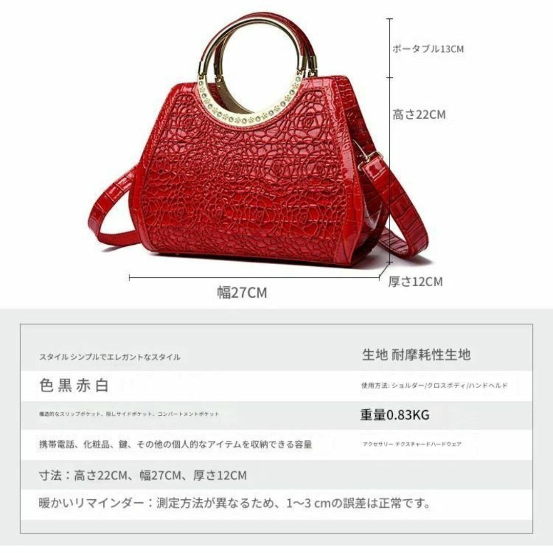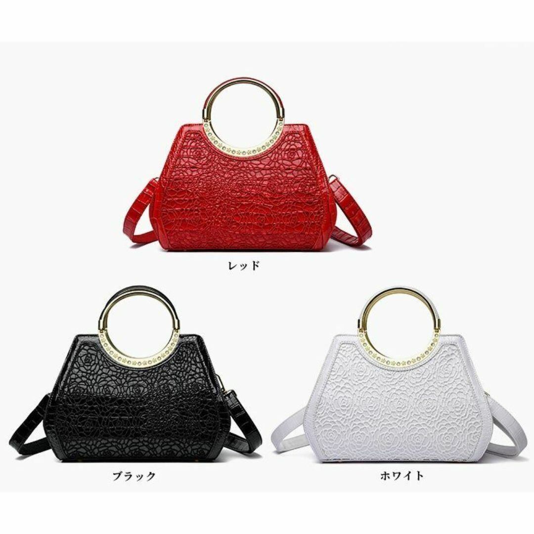 ショルダーバッグ ハンドバッグ レディース おしゃれ かわいい 円形の持ち手 前面に薔薇を模した刺繍 カラーバリエーション レッド ブラック ホワイト ショルダー ストラップ 旅行 ショッピング デート