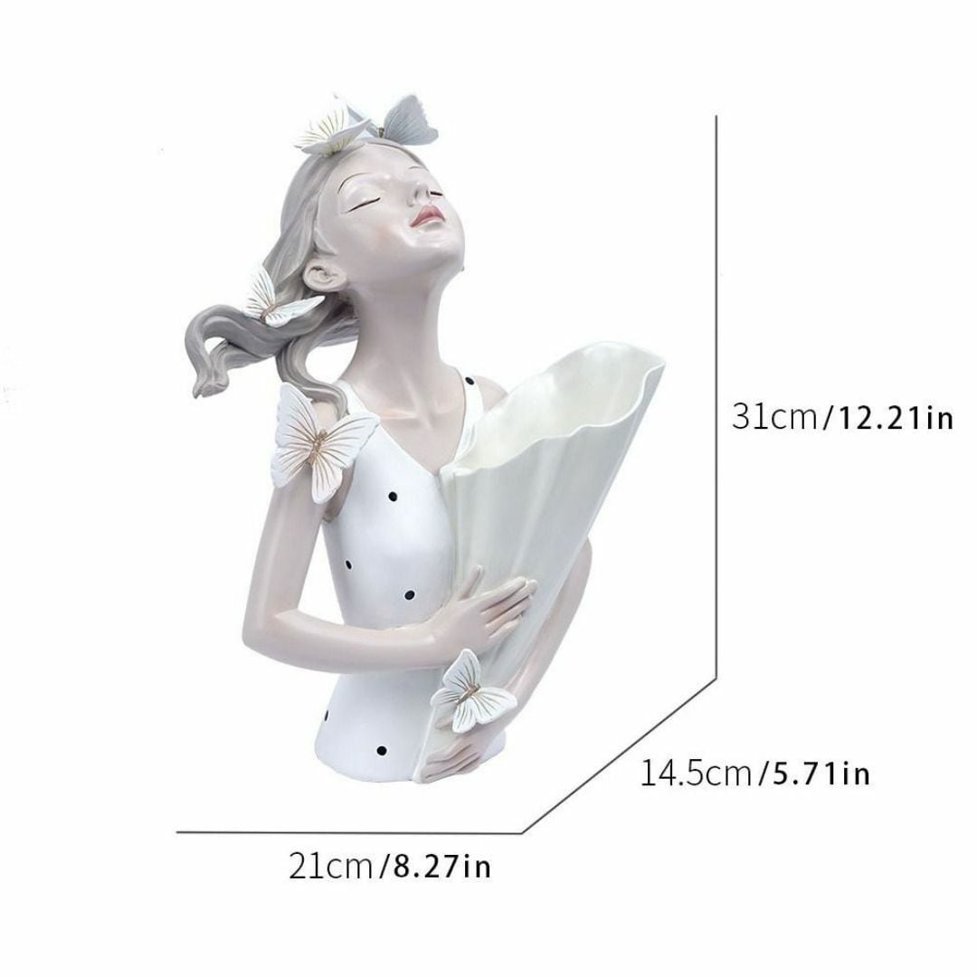 花束を大切に抱える女の子をモチーフにした、かわいらしい置物オブジェ。花束部分は花差しとなり、繊細な造形と優しい表情が空間に温もりを添えます。インテリアとしても映えるデザインで、ホワイト・オレンジ・ブルー・グリーン・グレー・ピンクの豊富なカラーバリエーションを展開。樹脂素材を用いた丁寧な手作り仕上げで、リビングや玄関などに置くだけで柔らかく優雅な印象を演出します。