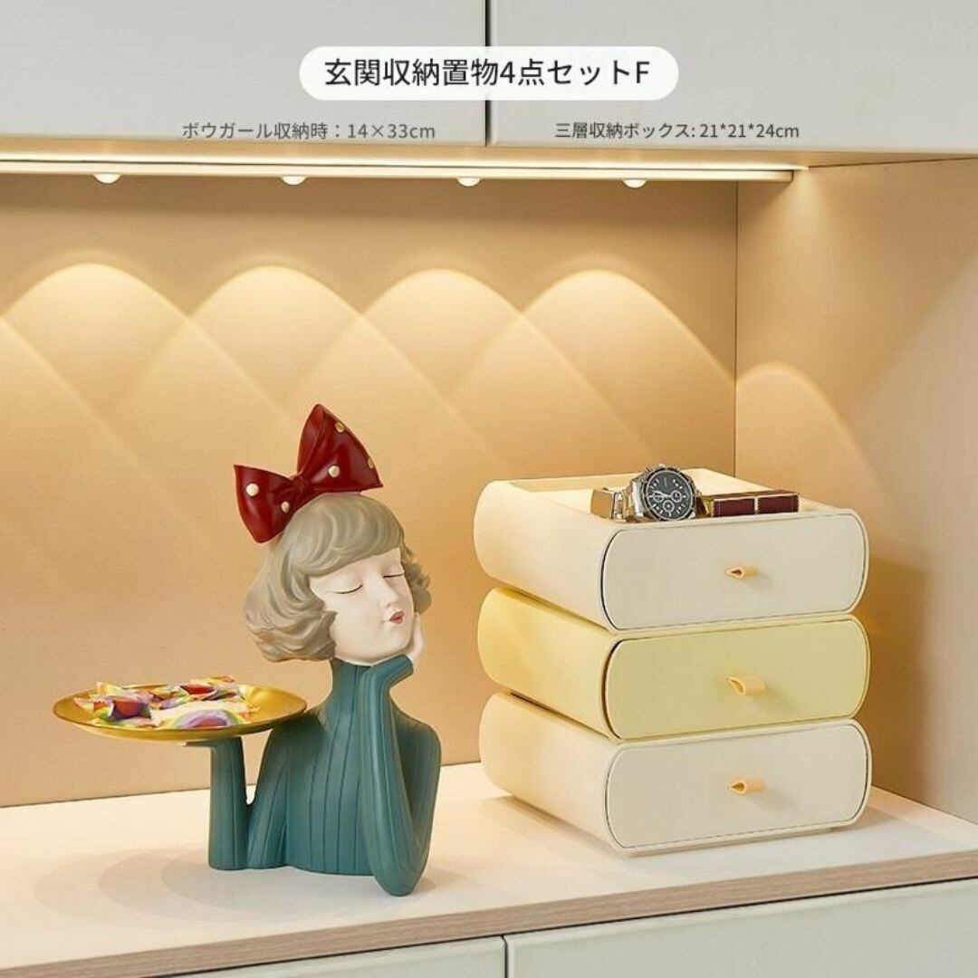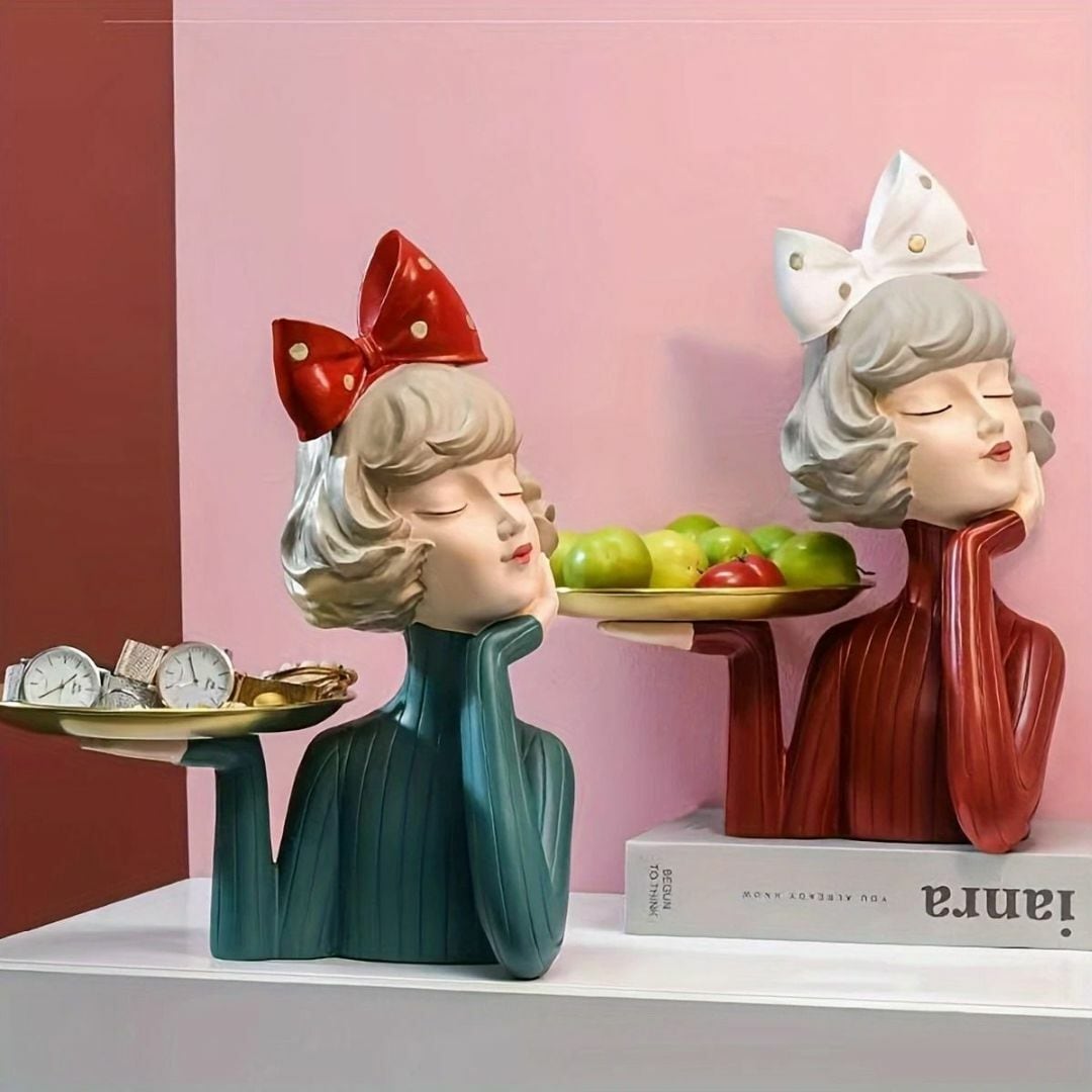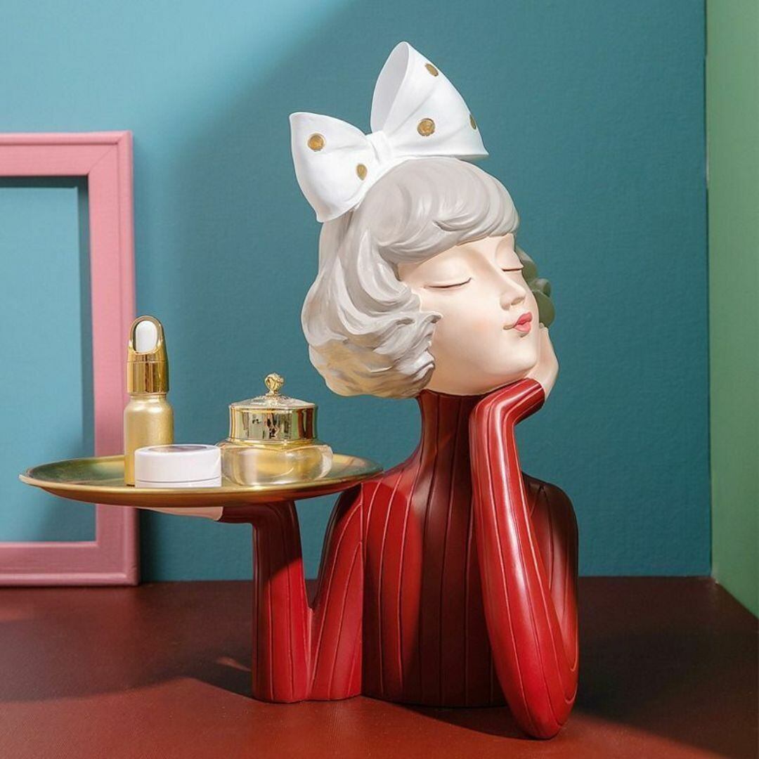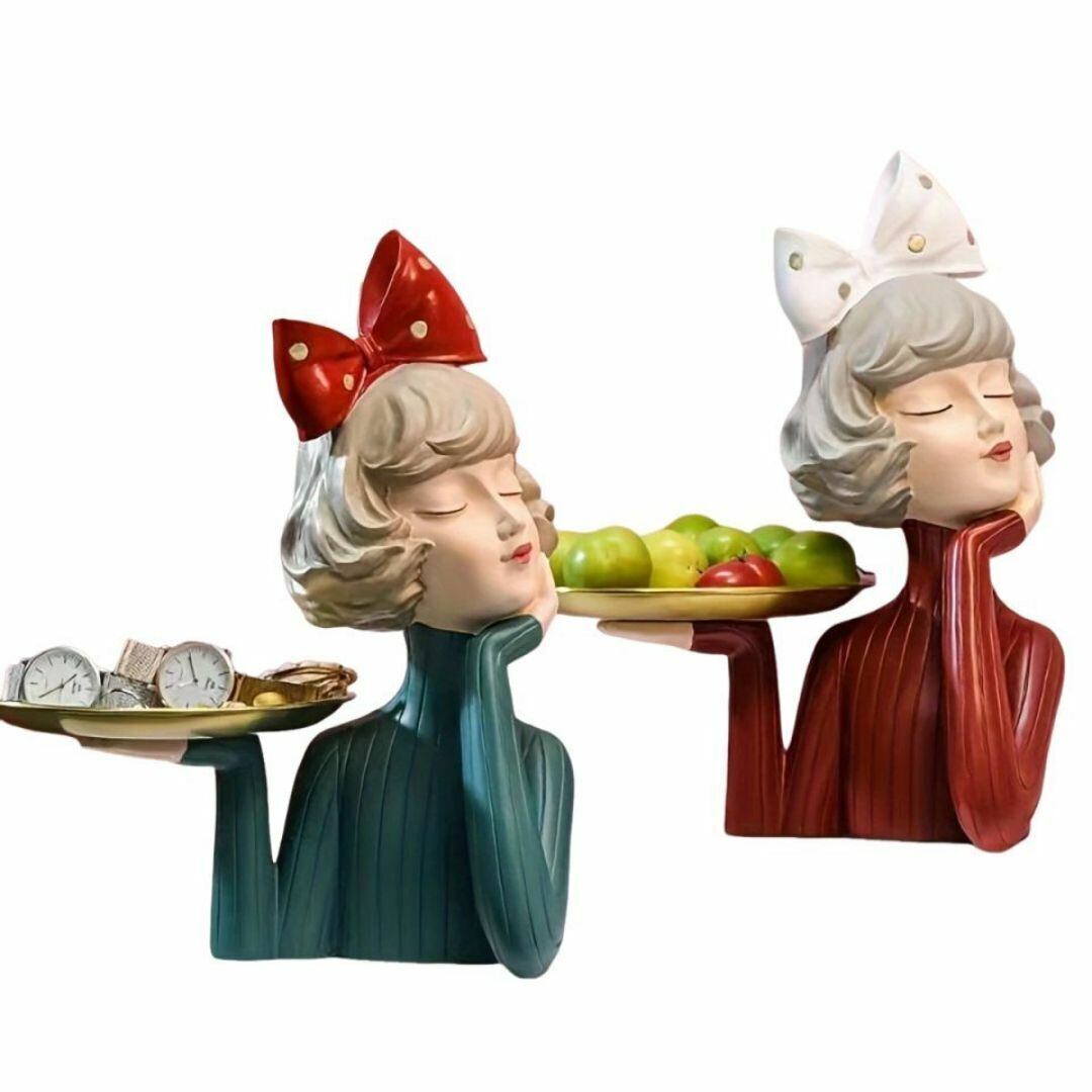 大きなリボンを頭に飾り、金色のプレートを手に持った女の子をモチーフにした、愛らしい小物置き兼オブジェ。手の込んだ樹脂製で繊細に造形され、手作りならではの温もりと高級感があります。グリーンとレッドの2色展開で、インテリアに華やかさと遊び心をプラス。リビングや玄関に置いて、小物を置くだけでなく、空間のアクセントにもなります。