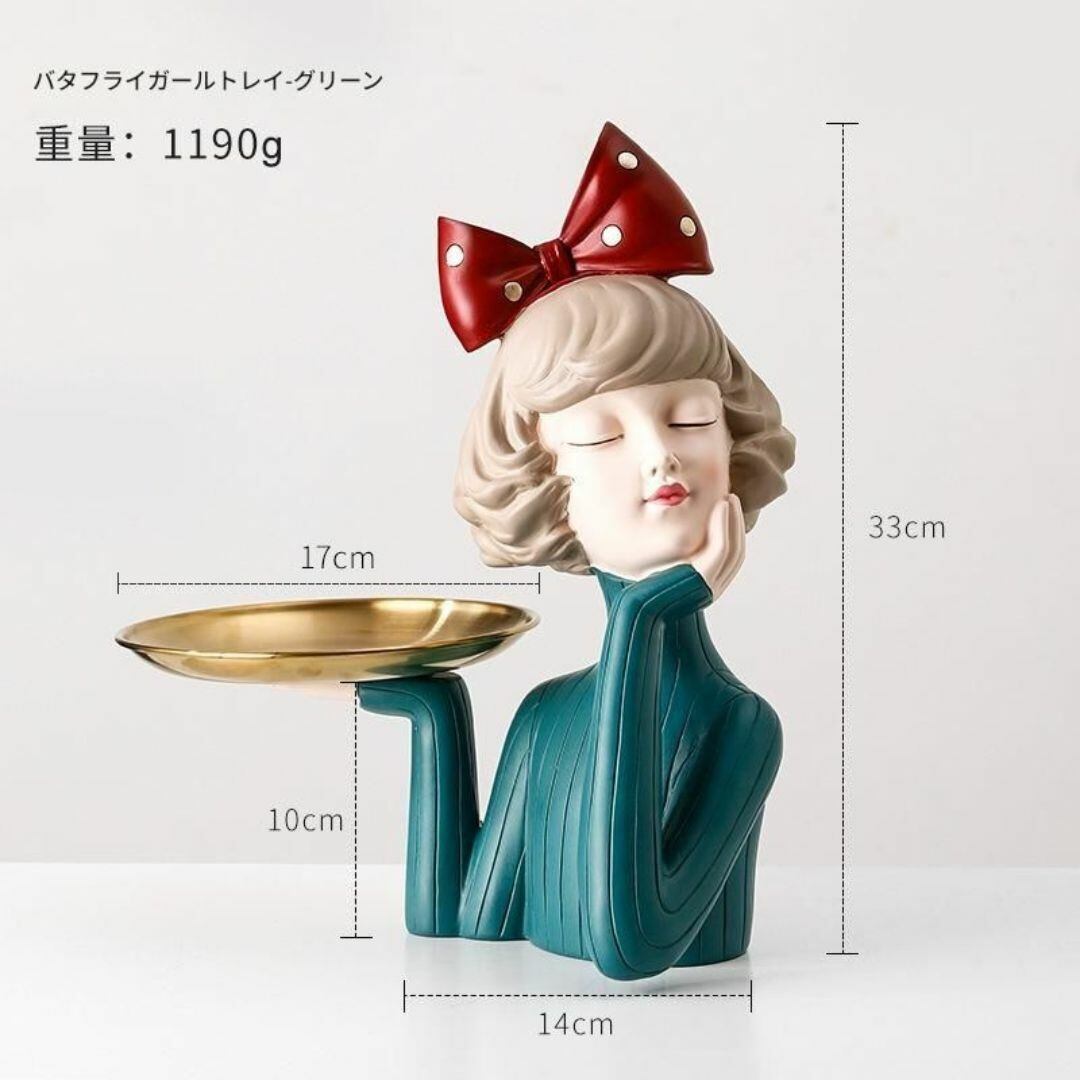 置物 オブジェ 小物置き かわいい おしゃれ 金のプレートを持った女の子 頭に大きなリボン カラーバリエーション グリーン レッド 樹脂 インテリア 繊細なつくり リビング 玄関 手作り
