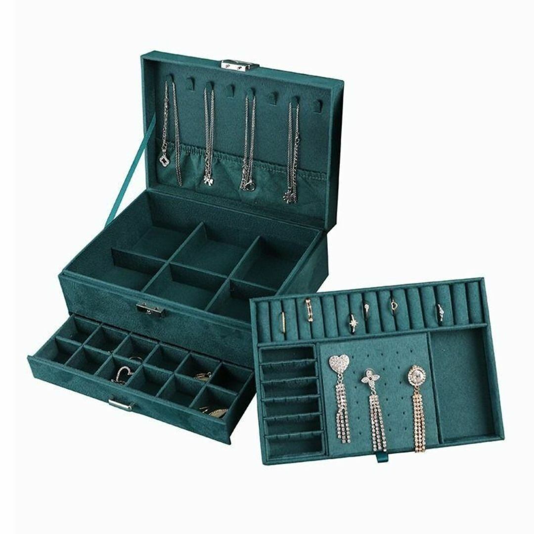 三段仕様でたっぷり収納できる、多機能なアクセサリーボックス。引き出しや取り外し可能な仕切り、ポケット付きで、指輪・時計・ネックレスなどのジュエリーをすっきり整理整頓。鍵付きで大切なアイテムも安心して保管できます。グリーンとブラックのシックなカラーバリエーションが揃い、ゴージャスでおしゃれなデザインはインテリアとしても映える存在。かわいらしさと実用性を兼ね備えたジュエリーボックスです。