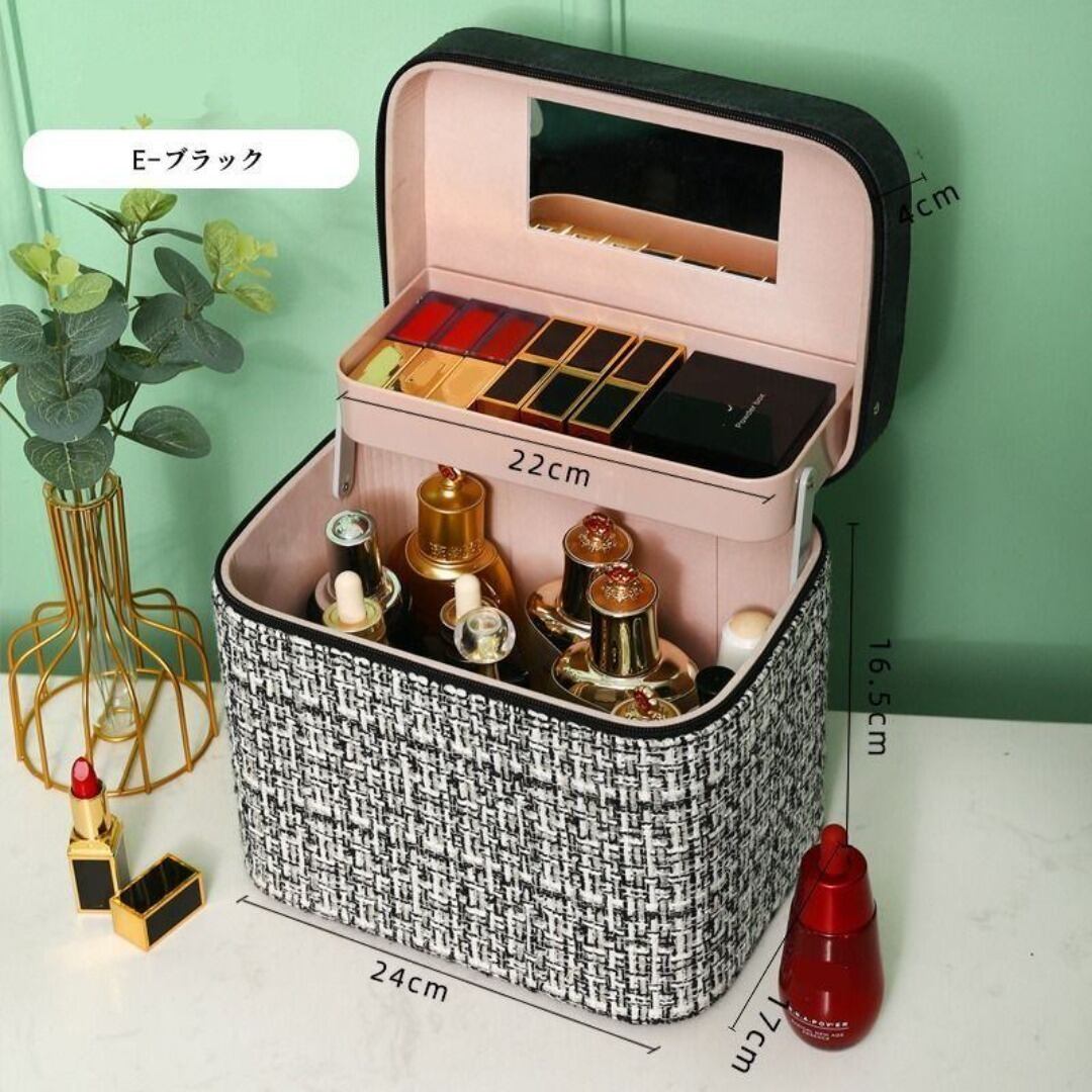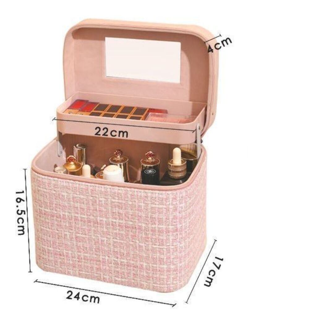 おしゃれな収納箱・収納ボックス。持ち運び可能で、多数の収納スペースを備えた多機能デザイン。大容量でコスメやメイク用品の整理に最適。ドレッサーやテーブル用収納として便利で、ピンク・ブラック・ブルーのカラーバリエーションから選べます。