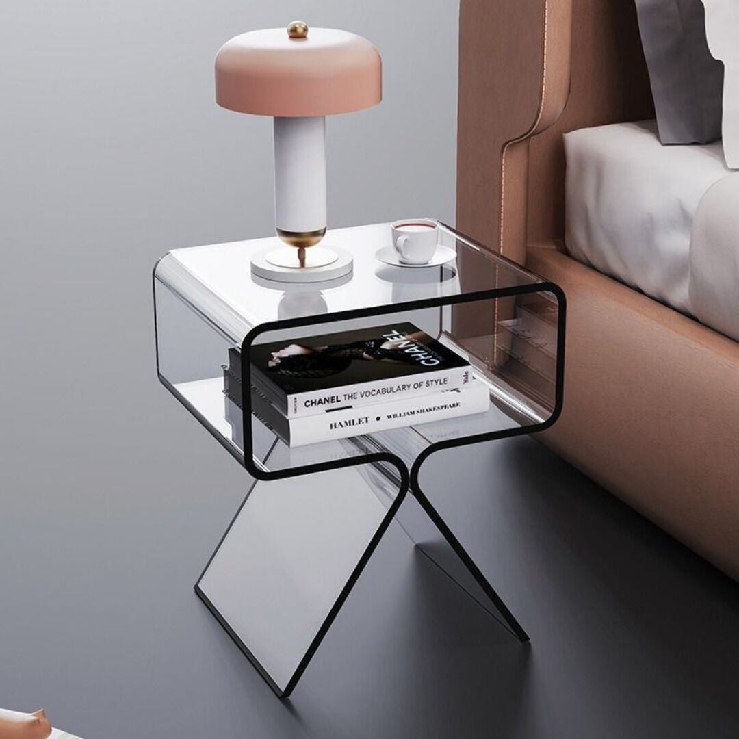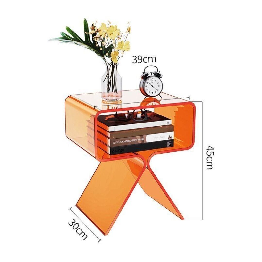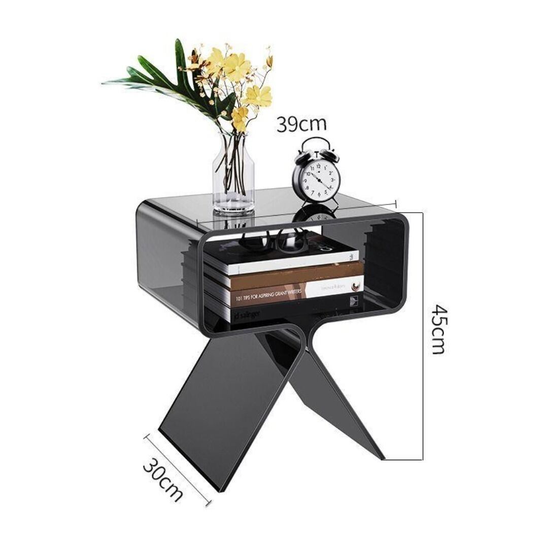 長方形デザインのスタイリッシュなサイドテーブル。高さ45cmでソファやベッド横にちょうどよく、真ん中に便利な棚付きで収納性も抜群です。アクリル素材を使用した透明感のある仕上がりで、お部屋にモダンな雰囲気をプラス。カフェやリビング、寝室、書斎、ホテル、オフィスなど幅広いシーンで活躍します。ブラックのカラーバリエーションで、落ち着いたおしゃれなインテリアにぴったりです。
