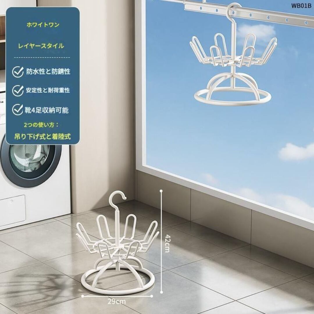 多機能に使えるシューズハンガー付きフロアスタンディング、フック付きで持ち運びや竿に引っかけることも可能。玄関まわりで靴やスリッパを掛けるのはもちろん、帽子やコートなどもすっきり収納できます。シンプルでおしゃれなデザインは空間に馴染みやすく、ブラック・ゴールド・ホワイトのカラーバリエーションから選べます。便利でスタイリッシュなインテリアアイテムです。