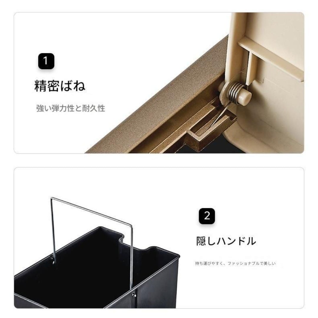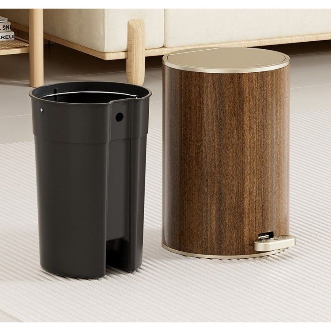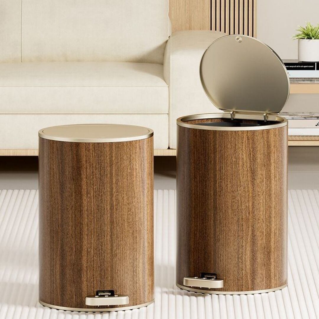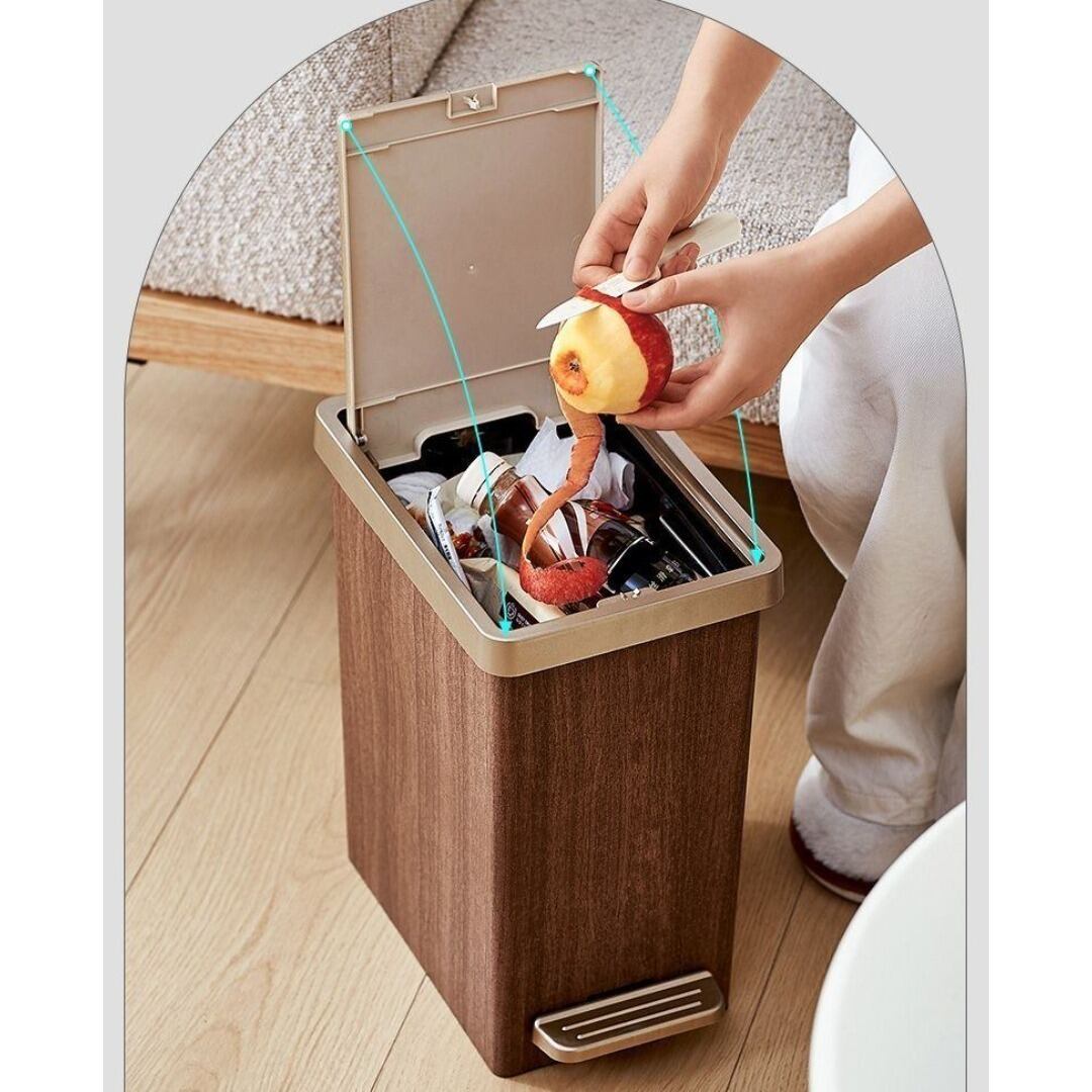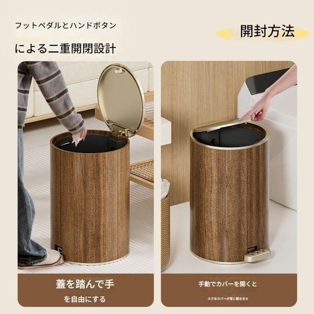 木目調が美しいスタイリッシュなゴミ箱。フットボタン式で手を使わずに開閉でき、衛生的に使用できます。内コンテナは取り外し可能で、お手入れも簡単。防水仕様のため、バスルームやトイレなど湿気の多い場所でも安心して使えます。長方形タイプと円柱タイプの2種類があり、インテリアや設置スペースに合わせて選択可能。9Lと12Lのサイズ展開で、リビングや寝室など様々なシーンにフィットする多機能デザインです。