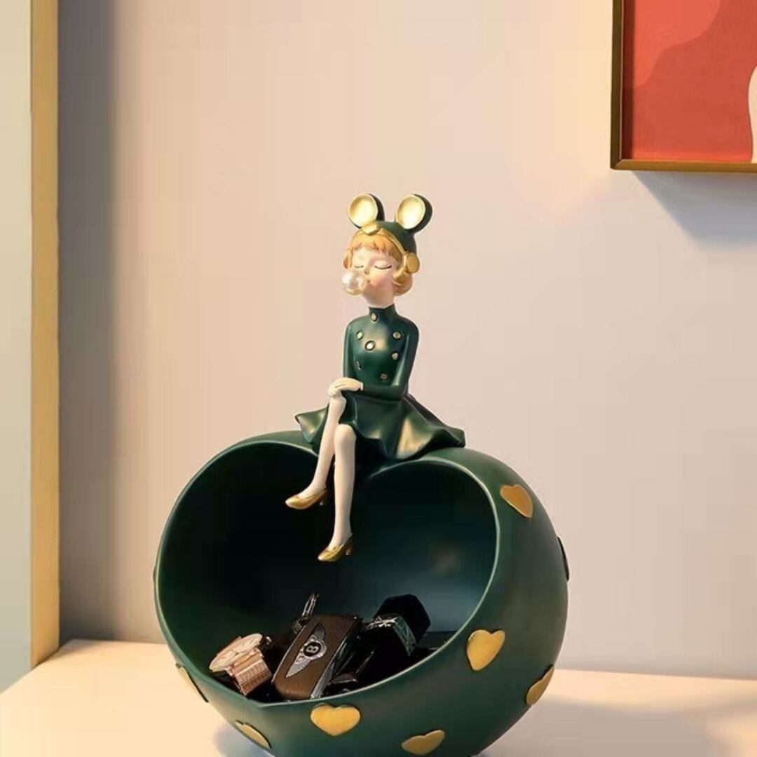 かわいらしいハート型の小物入れ。風船ガムを噛んで座る女の子のモチーフが施され、ハートの模様がアクセントになっています。オレンジ・ピンク・グリーンのカラーバリエーションで、リビングや寝室のインテリアにかわいく馴染みます。日常の小物整理に便利で、プレゼントやギフトにも最適なおしゃれな置物です。