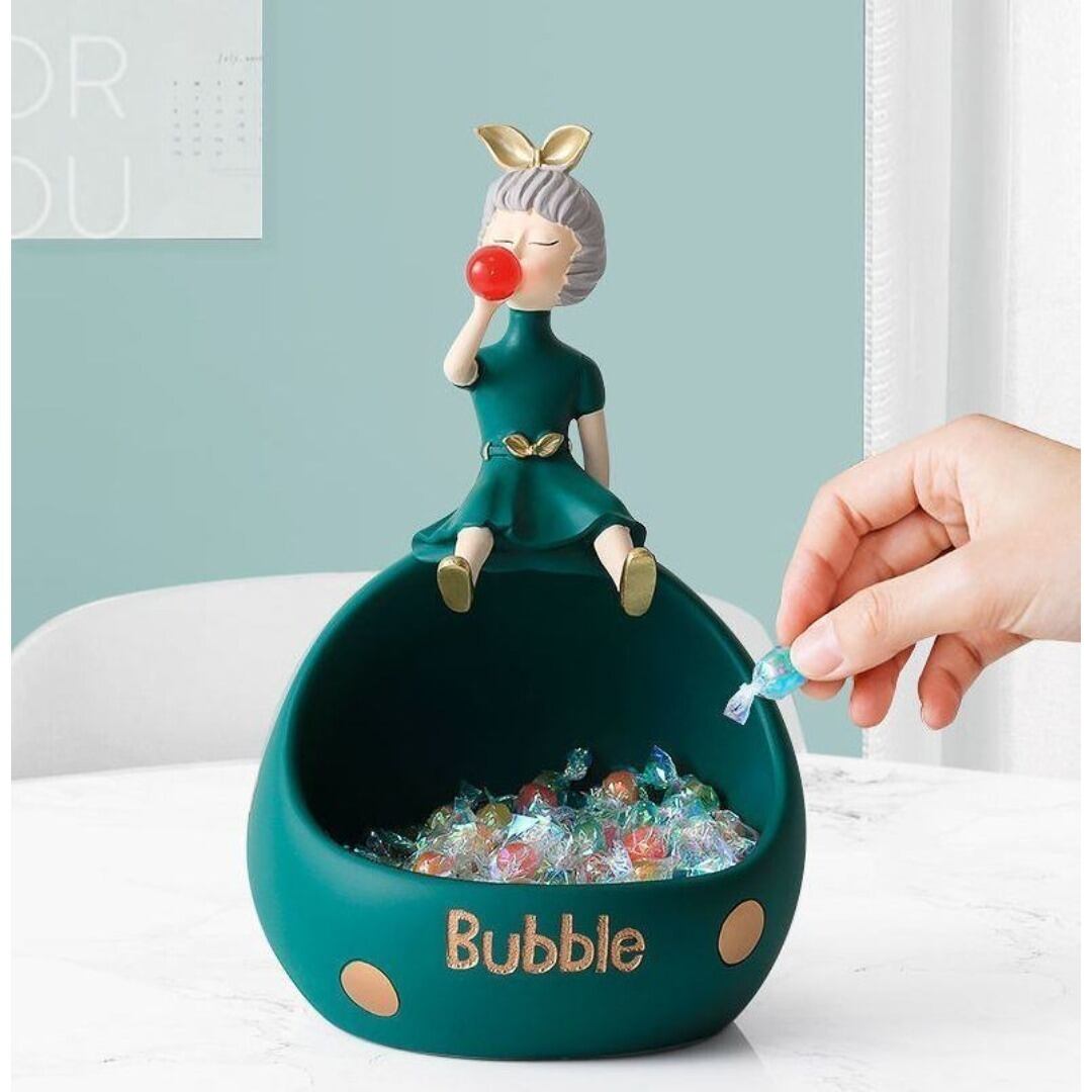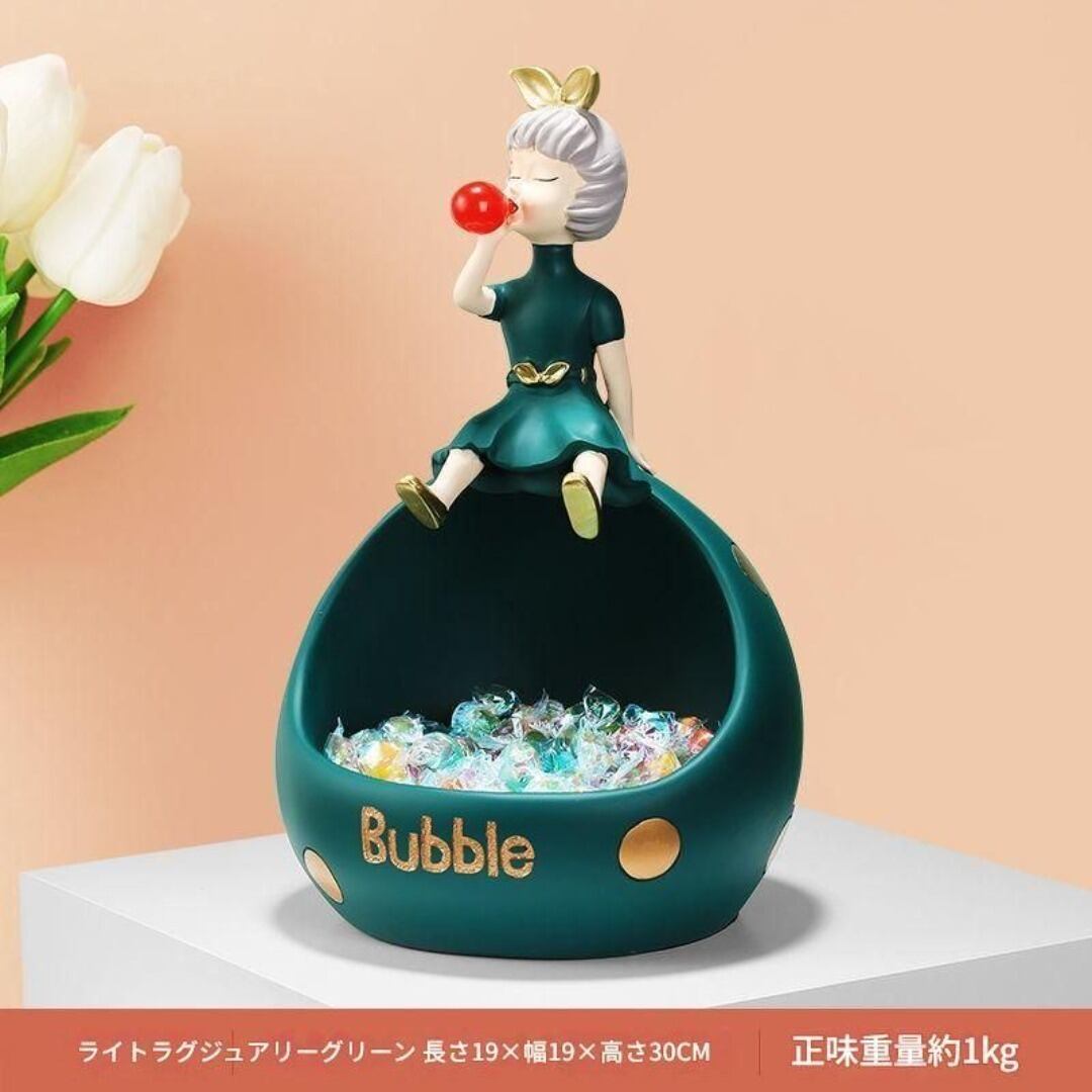 風船を膨らませる女の子がモチーフになった、ボール型の小物入れ。水玉模様のデザインがアクセントとなり、レッド・オレンジ・グリーンのカラーバリエーションが揃っています。かわいらしさと実用性を兼ね備え、リビングや寝室のインテリアとしても映えるおしゃれなアイテム。小物の整理やプレゼント、ギフトにもぴったりです。