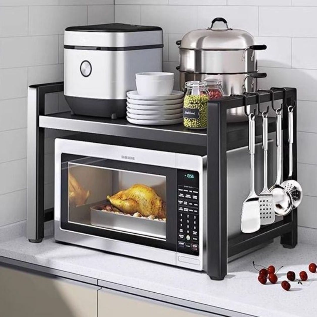 シンプルで機能的なスチールラック。電子レンジやオーブントースターなどのキッチン家電をすっきり収納でき、調理用具を掛けられるフック付きで使い勝手も抜群です。耐熱性・安定感に優れた設計で、安心して使用できます。掃除がしやすく、コンパクトながら収納力が高いのも魅力。ブラックの落ち着いたカラーが、キッチンをスタイリッシュに演出します。
