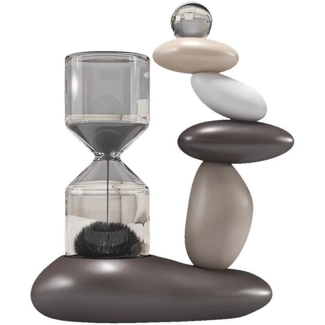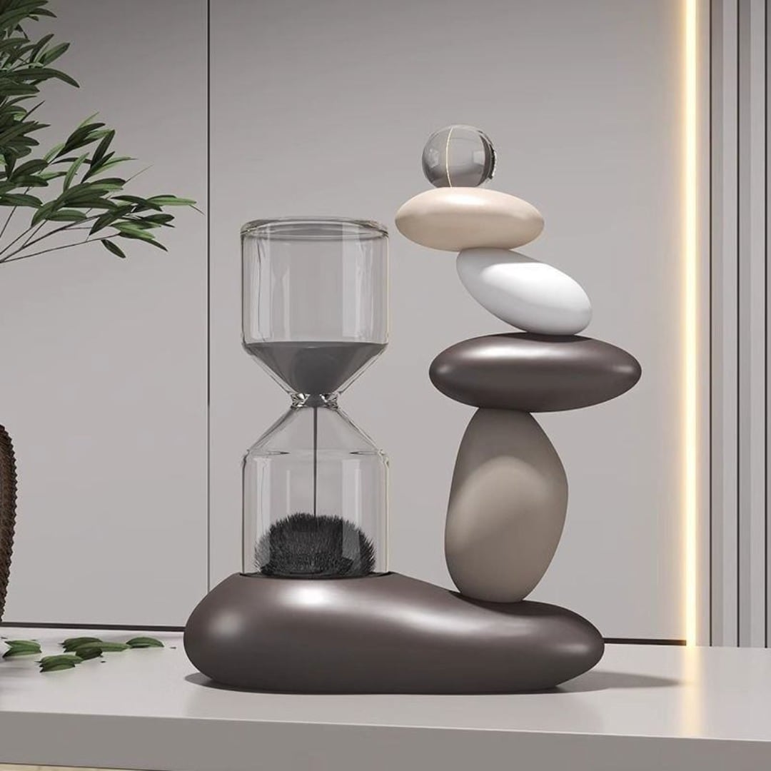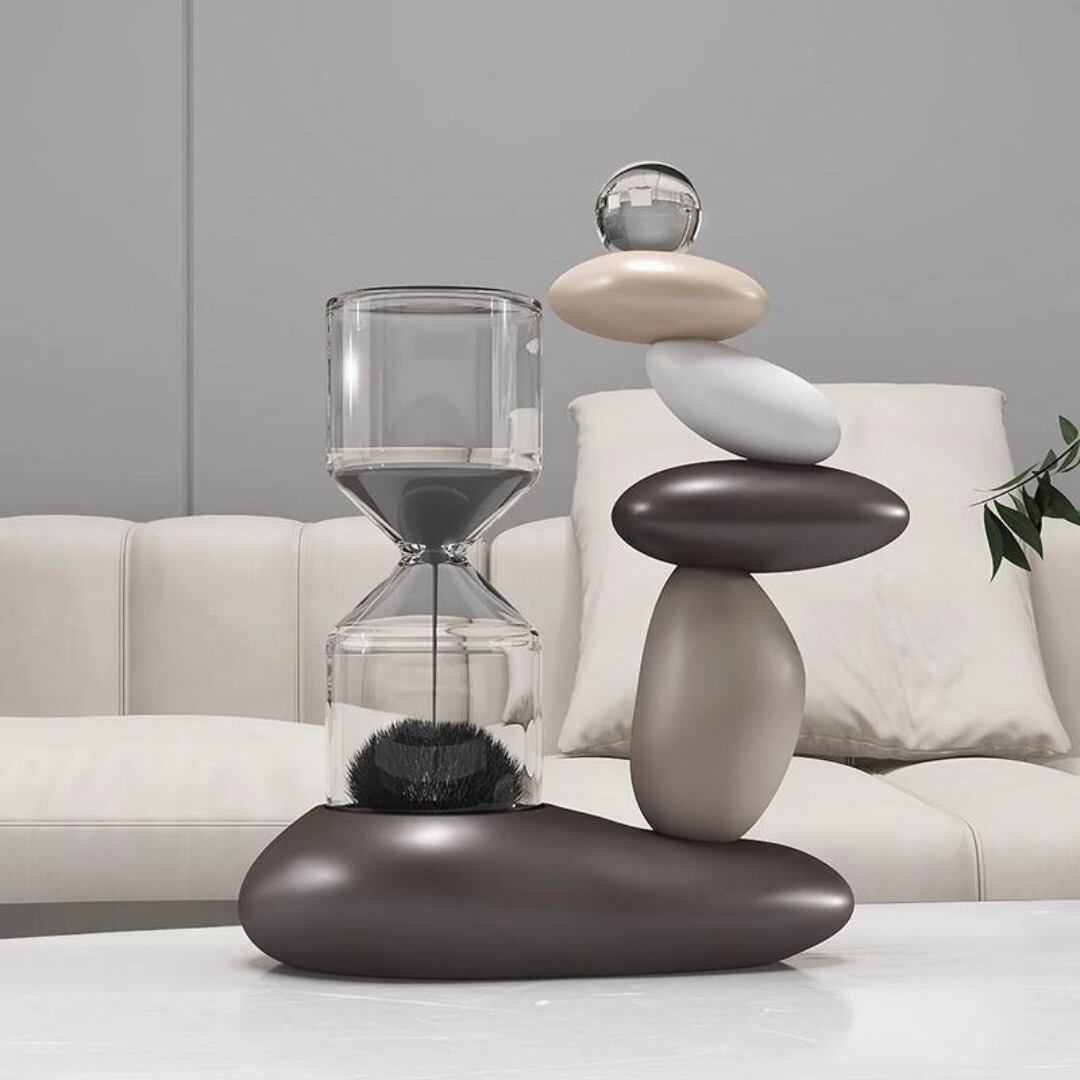 石が積みあがったような造形と砂鉄の砂時計を組み合わせた、独創的で存在感のある置物オブジェ。落ち着いたトーンとゴージャスな質感が魅力で、リビングや玄関、オフィス空間に上質なアクセントを添えます。樹脂製で扱いやすく、カラーバリエーションも豊富。インテリアとして楽しめるだけでなく、ギフトやプレゼントにも最適なアイテムです。