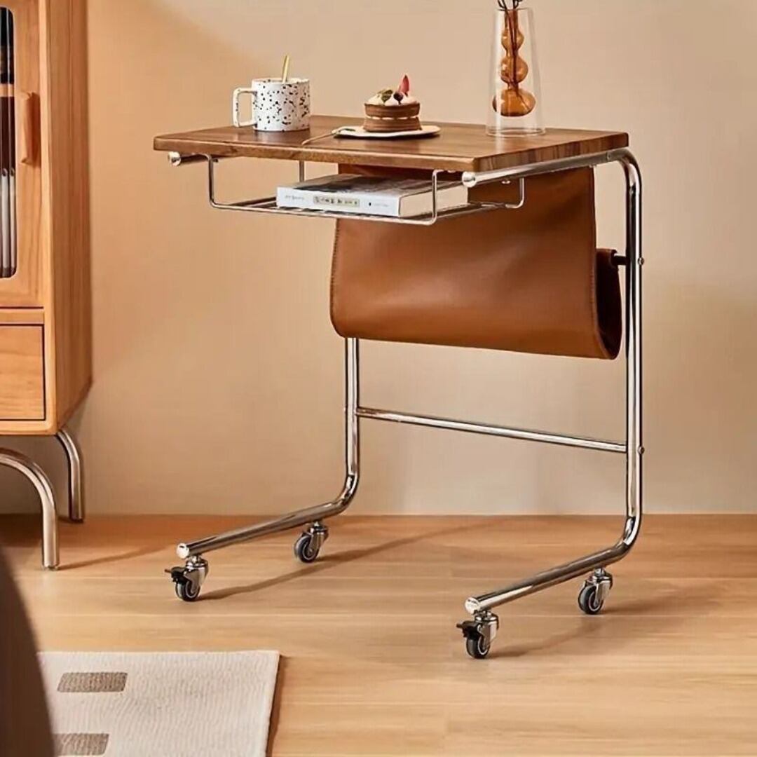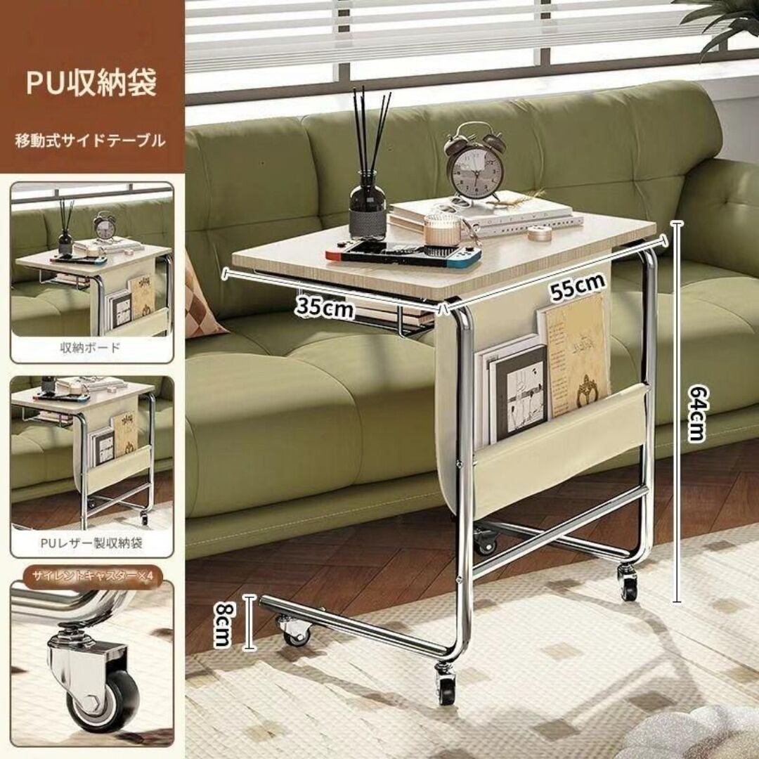 サイドテーブル キャスター付き 収納袋 おしゃれ 自由に移動 多機能コーヒーテーブル 便利 カラーバリエーション ホワイト ブラック ブラウン リビング ダイニング 寝室 ソファ脇 簡単移動 ストッパー付き