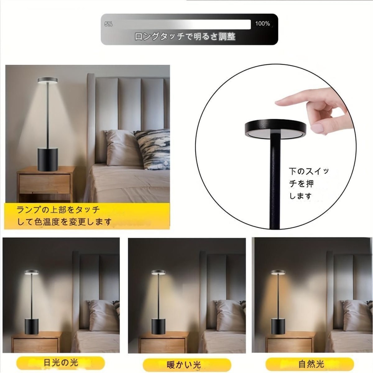 短押しでON / OFFと色温度を切り替えます。